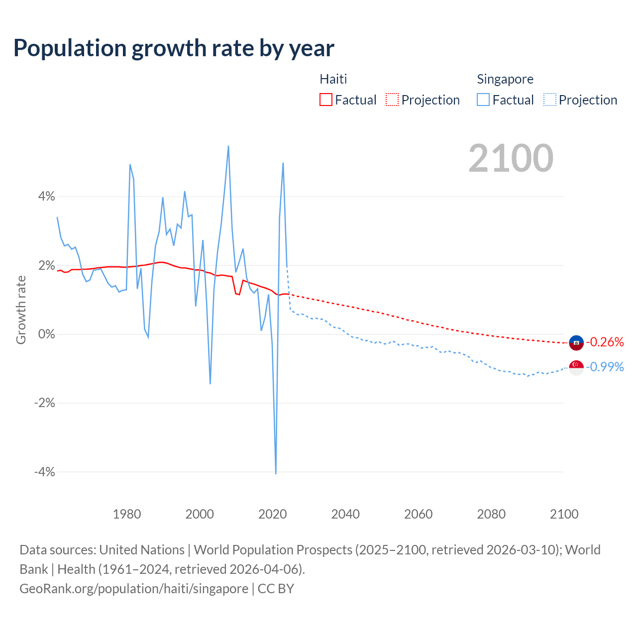 - For the last 10 years, Haiti has had an average growth rate of +1.29% per year vs +1.04% in Singapore.