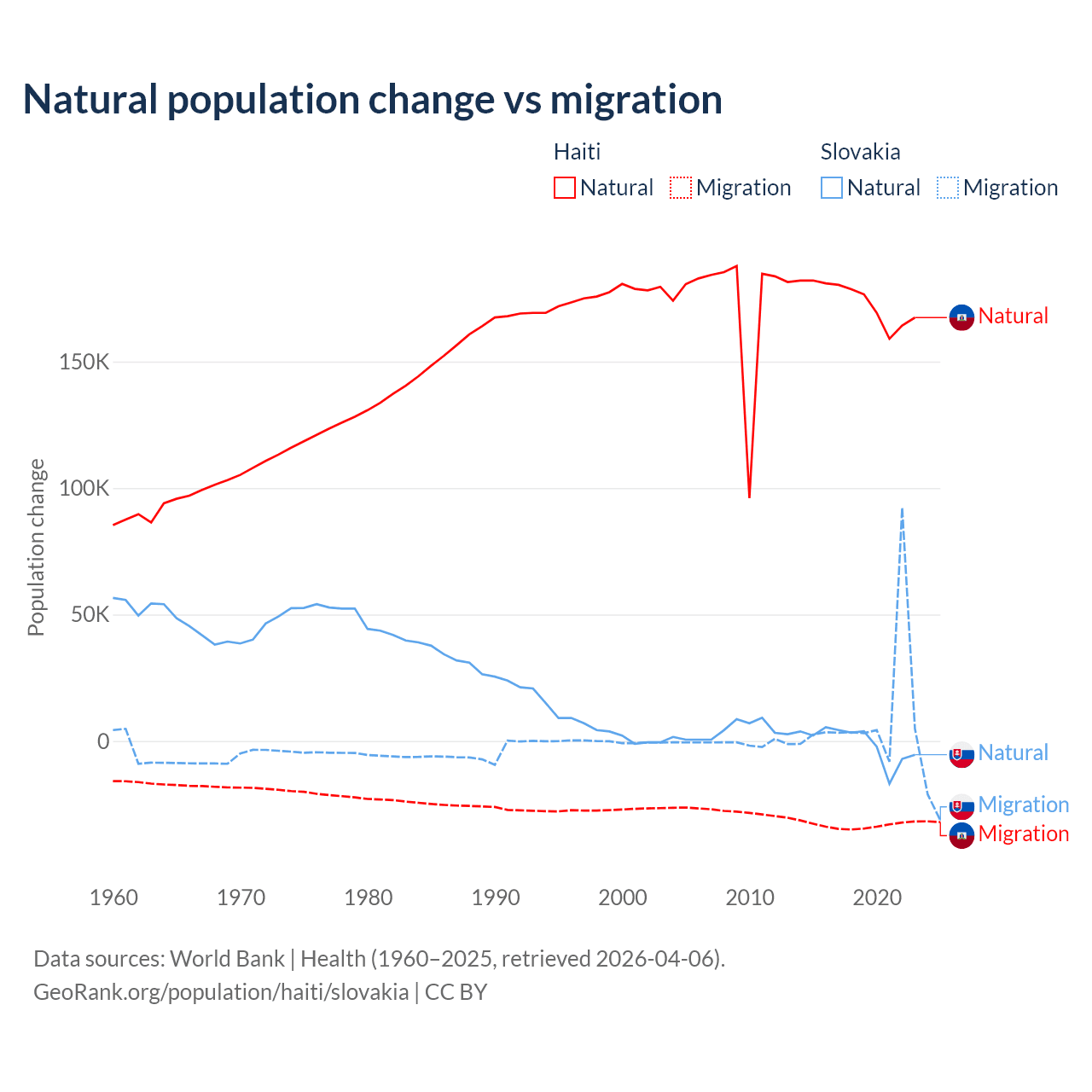 Over the last 10 years, 83.9% of the population change in Haiti is from natural causes (a gain of 1,740,319 people) and 16.1% is from migration (a loss of 333,076 people). In Slovakia 7.47% is from natural causes (a loss of 8,728 people) and 92.5% is from migration (a gain of 108,156 people).