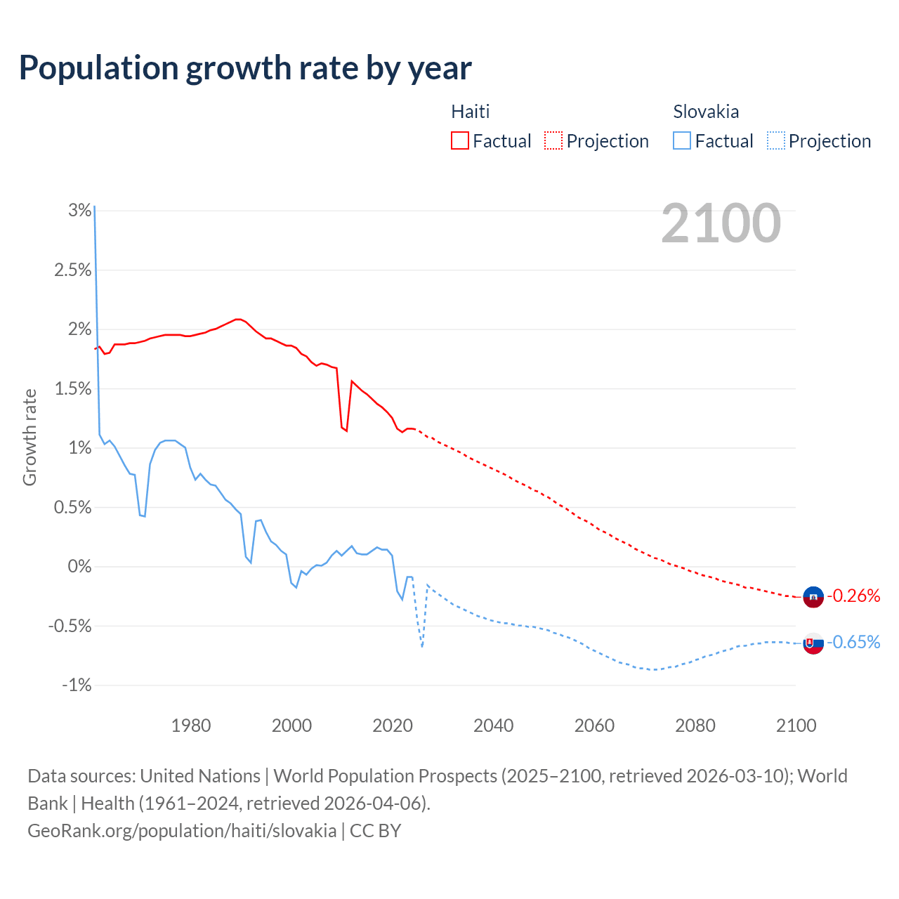 - For the last 10 years, Haiti has had an average growth rate of +1.29% per year vs +0.01% in Slovakia.