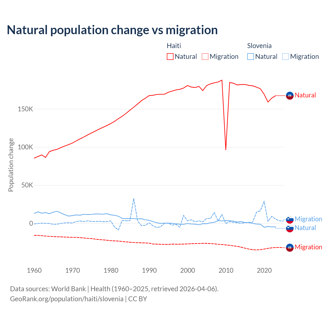 Over the last 10 years, 83.9% of the population change in Haiti is from natural causes (a gain of 1,740,319 people) and 16.1% is from migration (a loss of 333,076 people). In Slovenia 18.1% is from natural causes (a loss of 17,573 people) and 81.9% is from migration (a gain of 79,532 people).