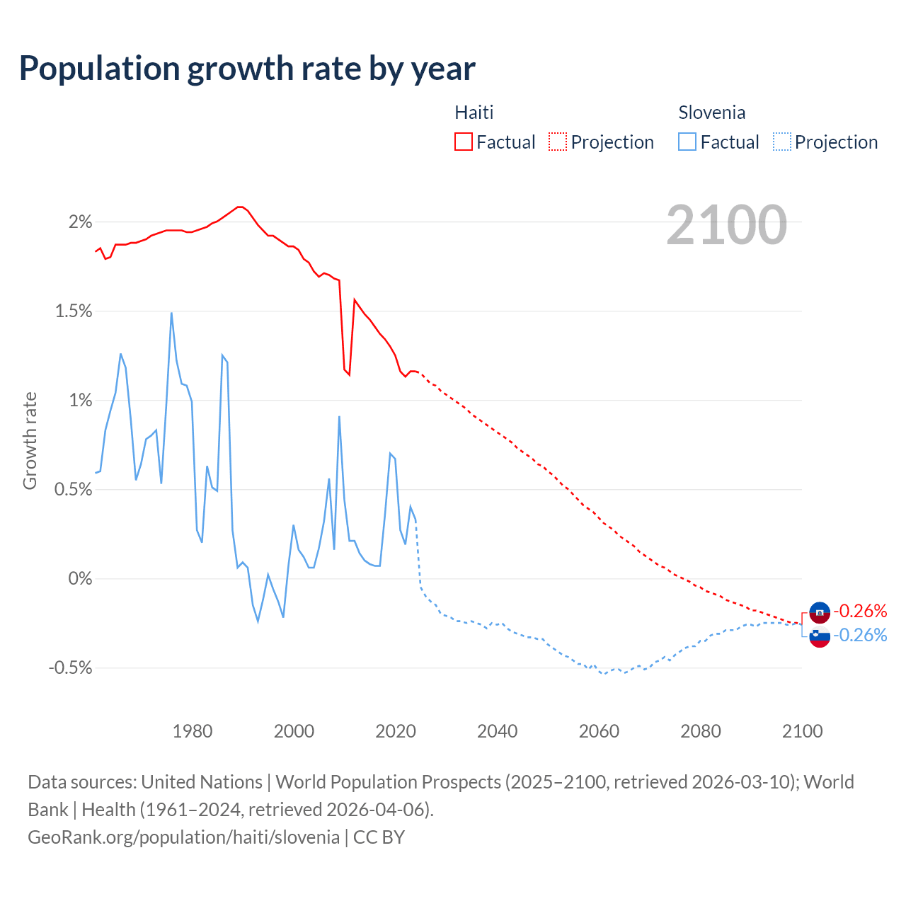 - For the last 10 years, Haiti has had an average growth rate of +1.29% per year vs +0.29% in Slovenia.