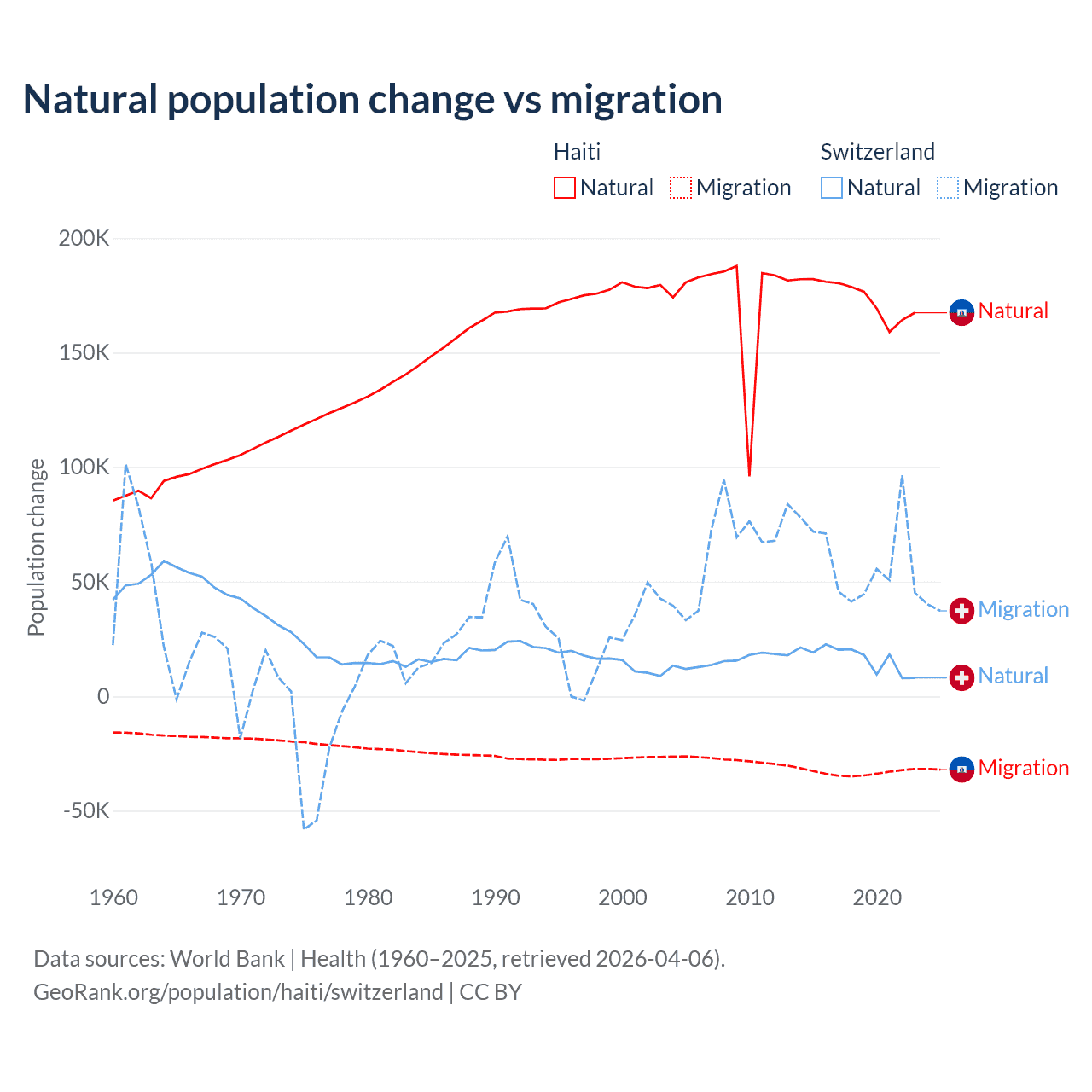 Over the last 10 years, 83.9% of the population change in Haiti is from natural causes (a gain of 1,740,319 people) and 16.1% is from migration (a loss of 333,076 people). In Switzerland 21.6% is from natural causes (a gain of 165,354 people) and 78.4% is from migration (a gain of 600,145 people).