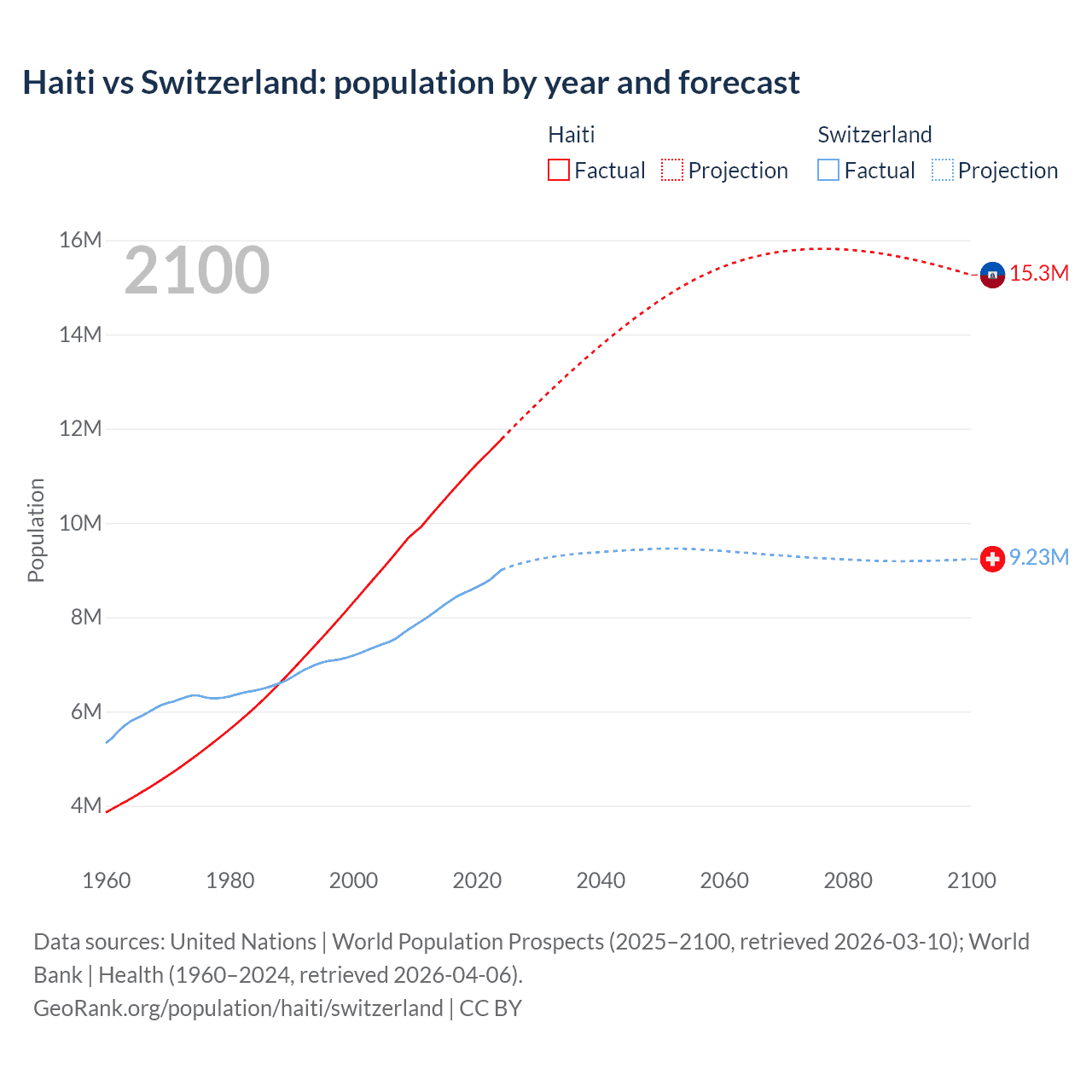 Haiti vs Switzerland: population by year and forecast