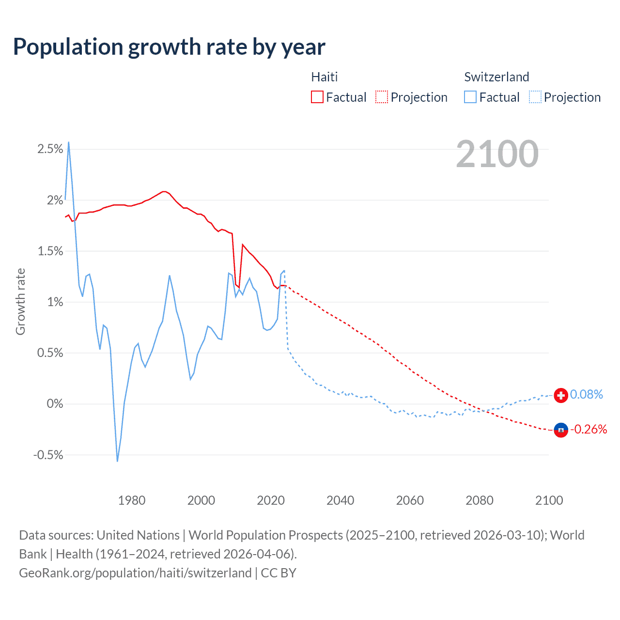 - For the last 10 years, Haiti has had an average growth rate of +1.29% per year vs +0.98% in Switzerland.