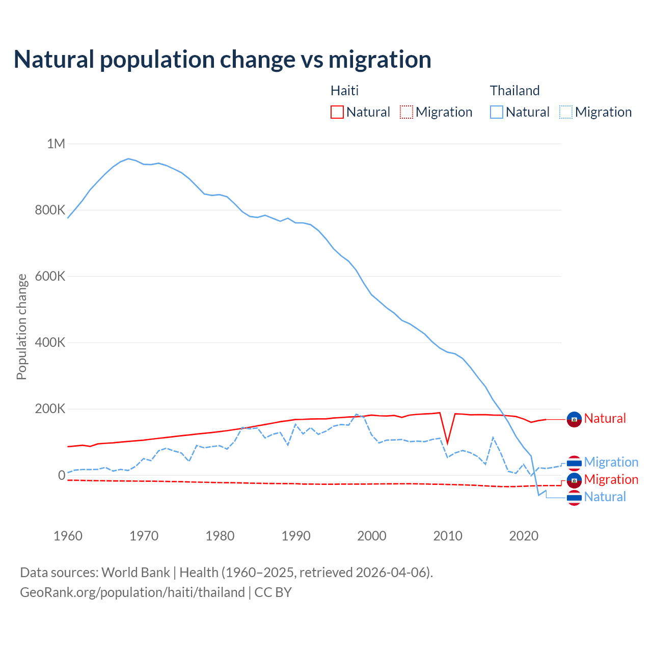 Over the last 10 years, 83.9% of the population change in Haiti is from natural causes (a gain of 1,740,319 people) and 16.1% is from migration (a loss of 333,076 people). In Thailand 78.4% is from natural causes (a gain of 1,292,528 people) and 21.6% is from migration (a gain of 355,361 people).