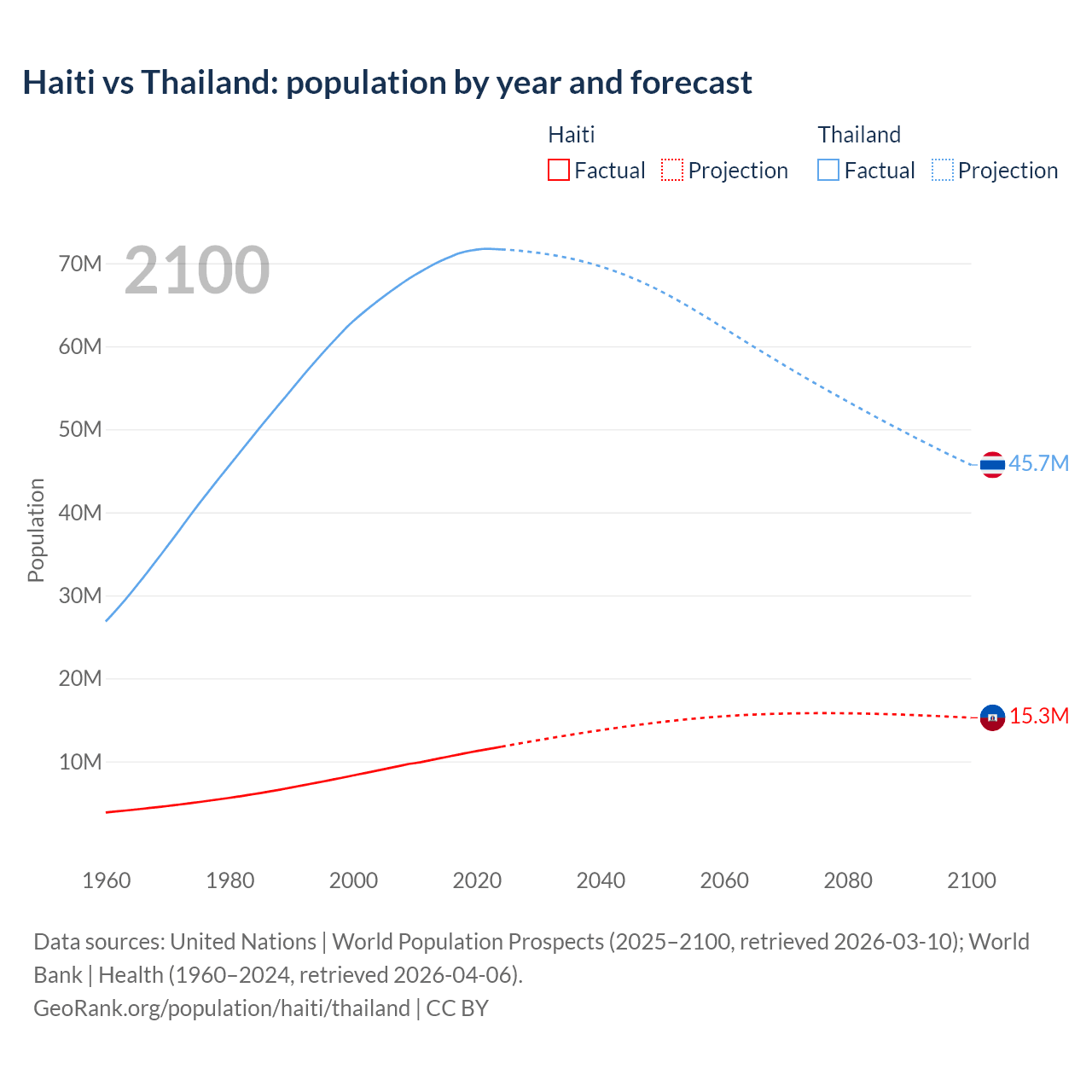 The latest officially reported population of Haiti was 11,772,557 in 2024 vs 71,668,011 people in Thailand in 2024. In 2026, based on the adjusted UN estimation, the current Haiti's population is 12,076,663 people compared to 71,571,743 in Thailand.