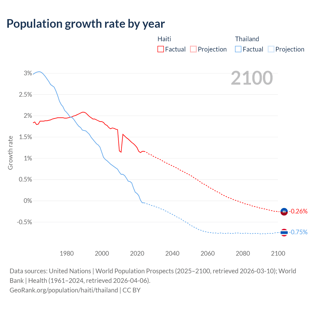- For the last 10 years, Haiti has had an average growth rate of +1.29% per year vs +0.23% in Thailand.