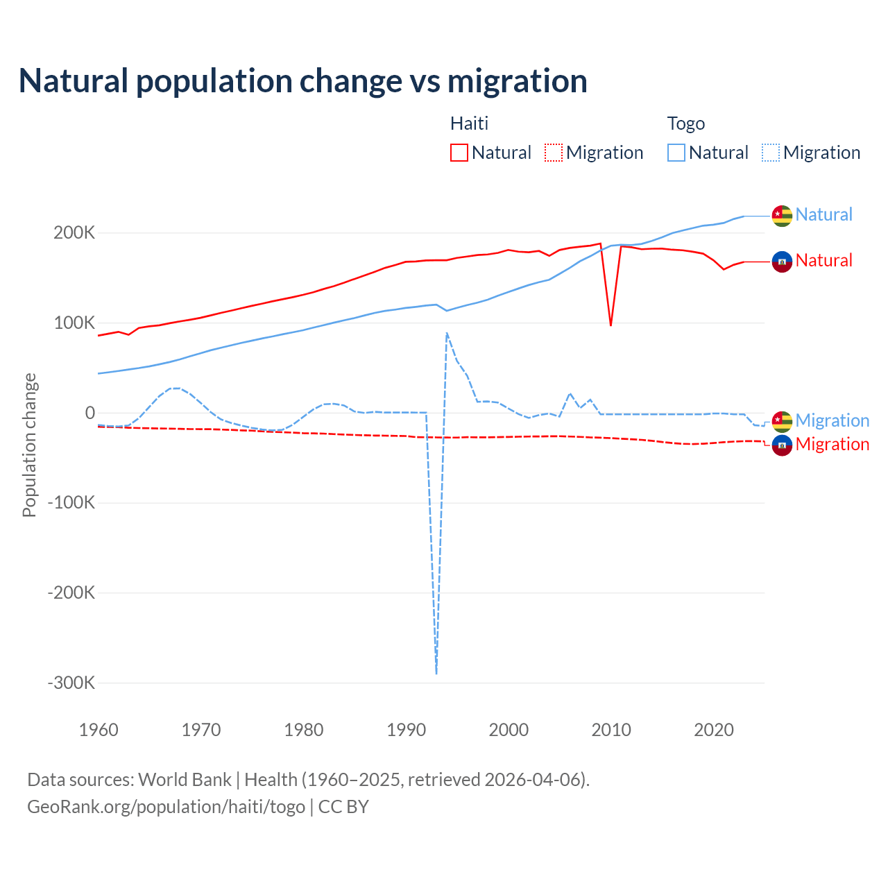 Over the last 10 years, 83.9% of the population change in Haiti is from natural causes (a gain of 1,740,319 people) and 16.1% is from migration (a loss of 333,076 people). In Togo 99.1% is from natural causes (a gain of 2,052,115 people) and 0.86% is from migration (a loss of 17,852 people).