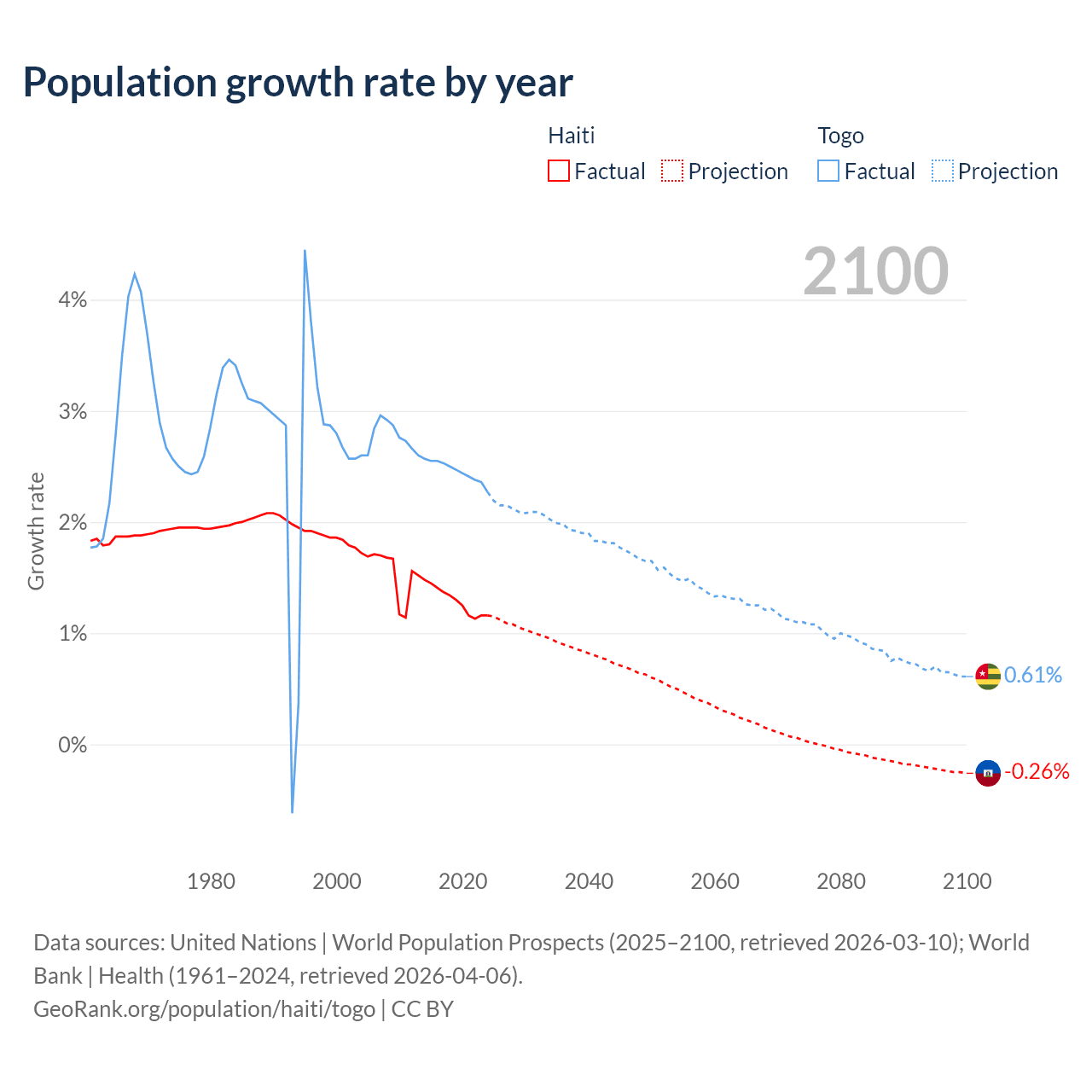 - For the last 10 years, Haiti has had an average growth rate of +1.29% per year vs +2.46% in Togo.