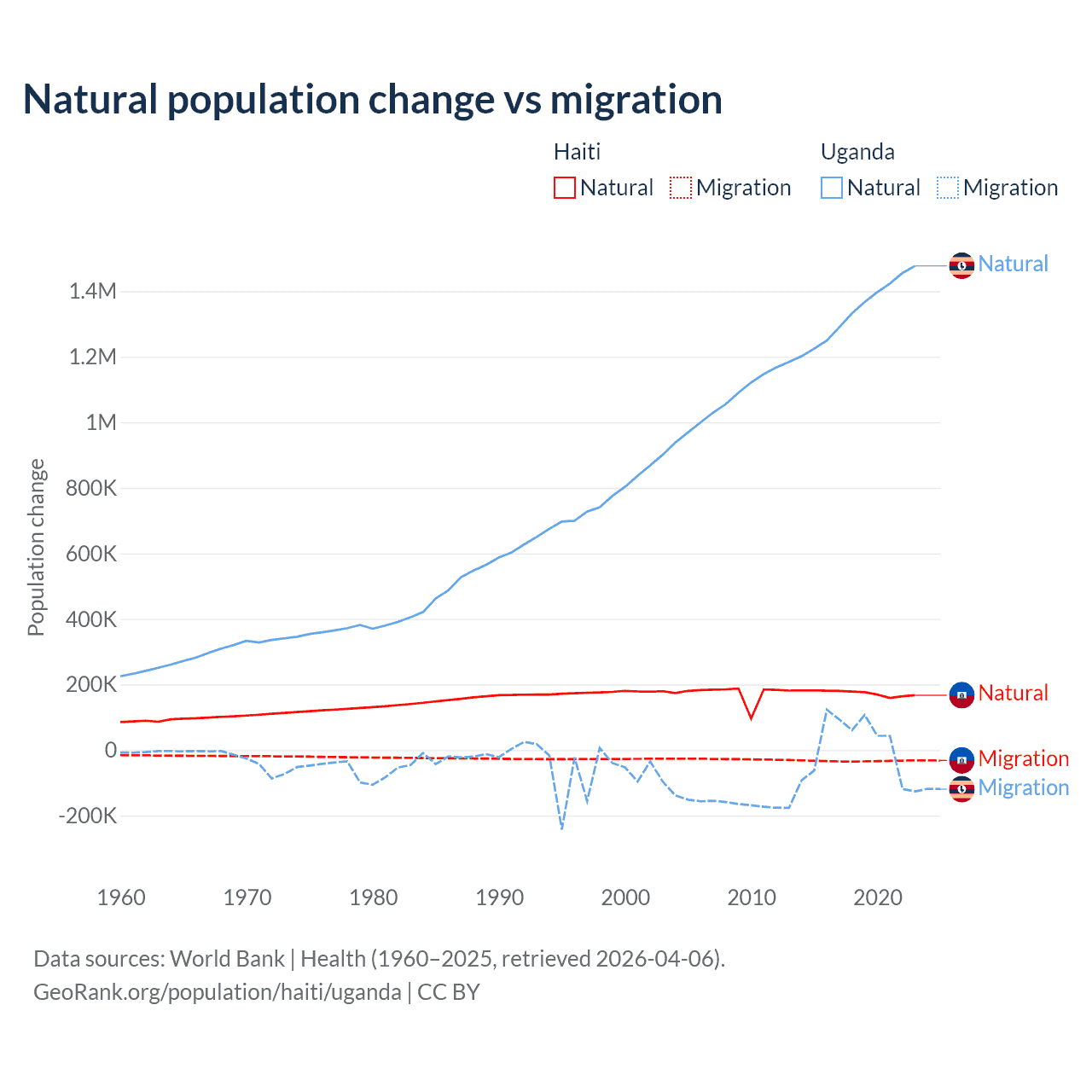 Over the last 10 years, 83.9% of the population change in Haiti is from natural causes (a gain of 1,740,319 people) and 16.1% is from migration (a loss of 333,076 people). In Uganda 99.5% is from natural causes (a gain of 13,419,712 people) and 0.53% is from migration (a gain of 71,457 people).