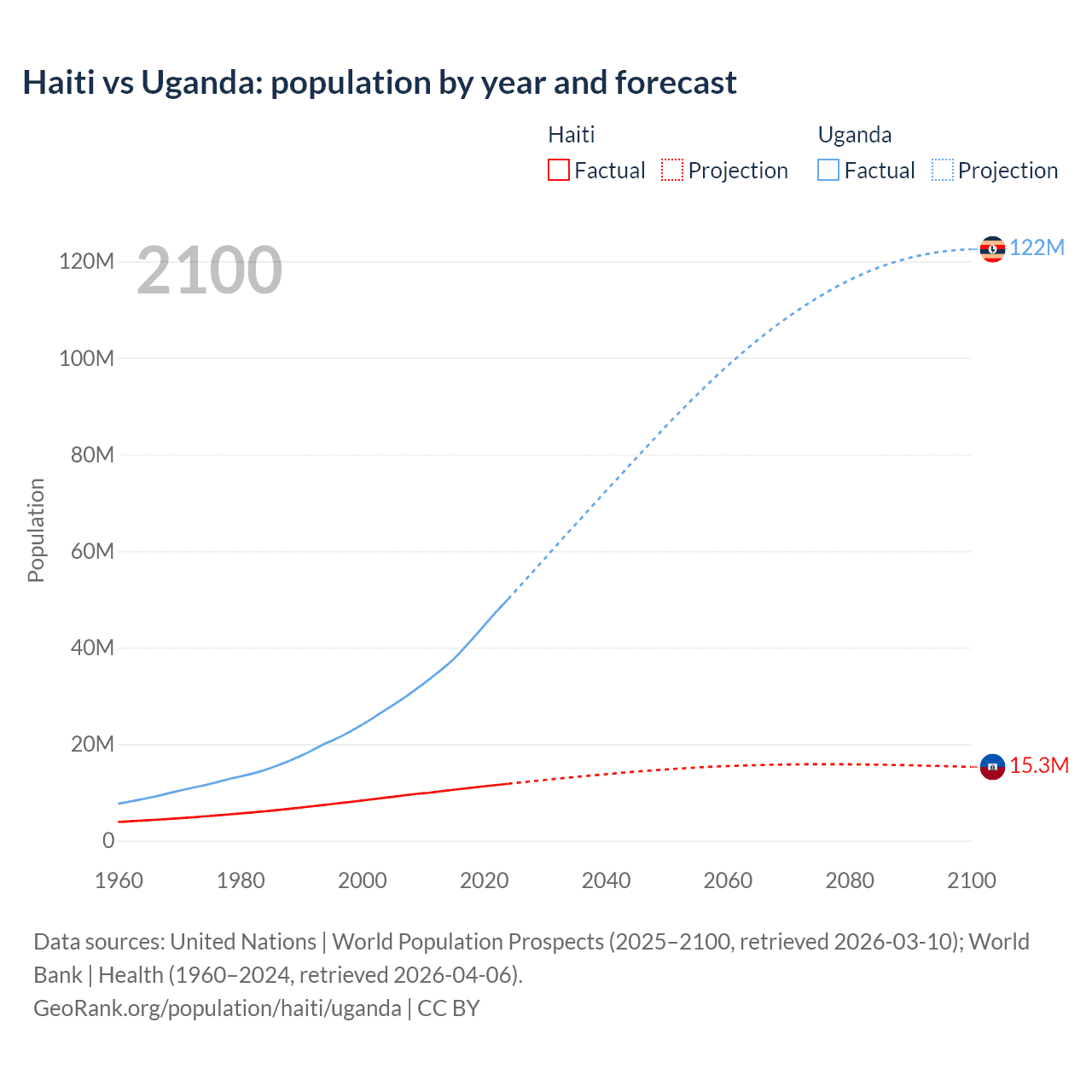 - For the last 10 years, Haiti has had an average growth rate of +1.29% per year vs +3.21% in Uganda.
