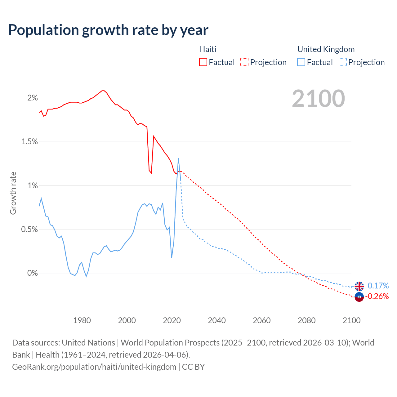 - For the last 10 years, Haiti has had an average growth rate of +1.29% per year vs +0.7% in the United Kingdom.