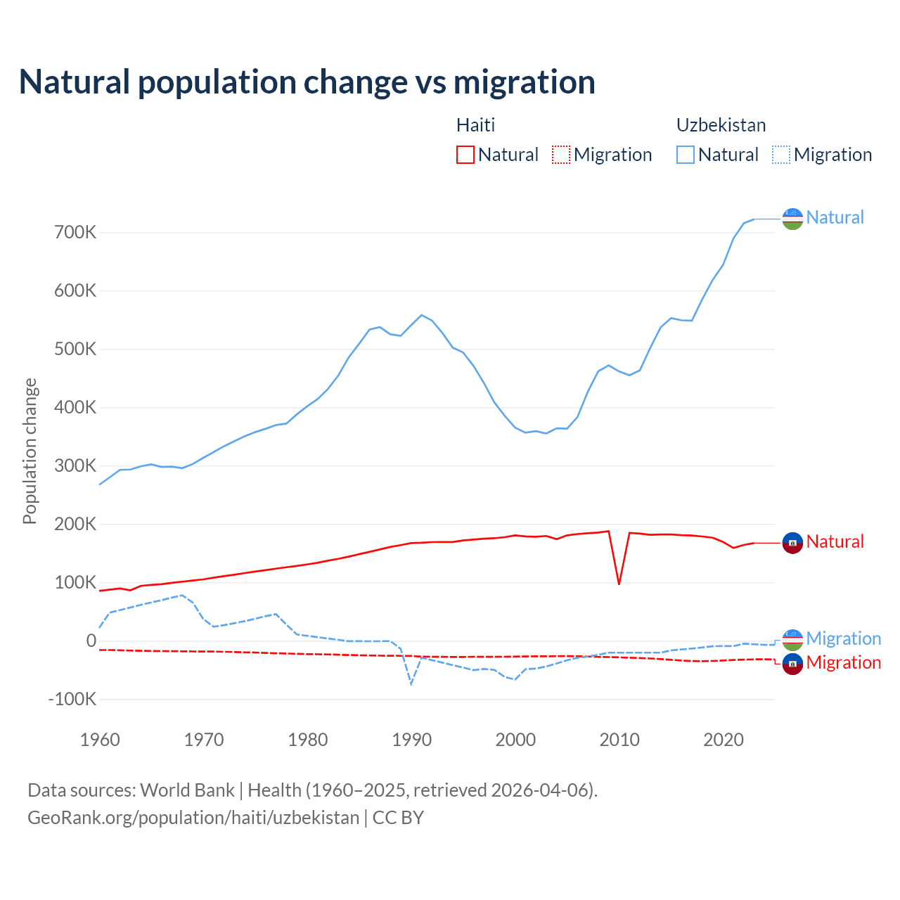Over the last 10 years, 83.9% of the population change in Haiti is from natural causes (a gain of 1,740,319 people) and 16.1% is from migration (a loss of 333,076 people). In Uzbekistan 98.2% is from natural causes (a gain of 6,161,117 people) and 1.84% is from migration (a loss of 115,398 people).