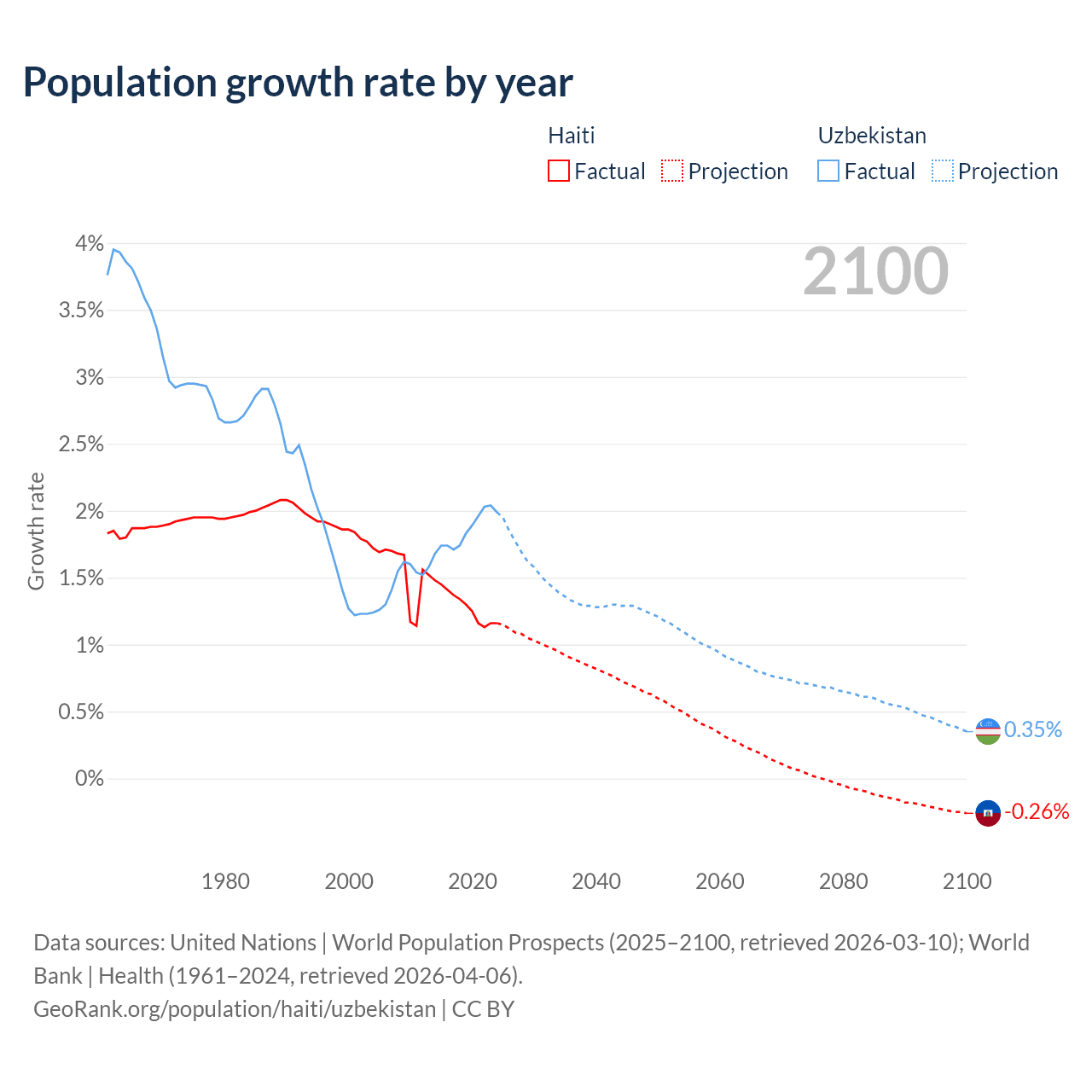 Data sources: World Bank | Health (1960–2024, retrieved 2026-04-06); United Nations | World Population Prospects (1960–2026, retrieved 2026-03-10); U.S. Census Bureau (1960–2025, retrieved 2026-02-08); Central Intelligence Agency (CIA) (2000–2019, retrieved 2026-02-20).