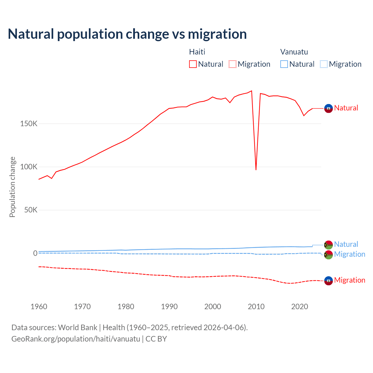 Over the last 10 years, 83.9% of the population change in Haiti is from natural causes (a gain of 1,740,319 people) and 16.1% is from migration (a loss of 333,076 people). In Vanuatu 92.2% is from natural causes (a gain of 72,941 people) and 7.81% is from migration (a loss of 6,181 people).