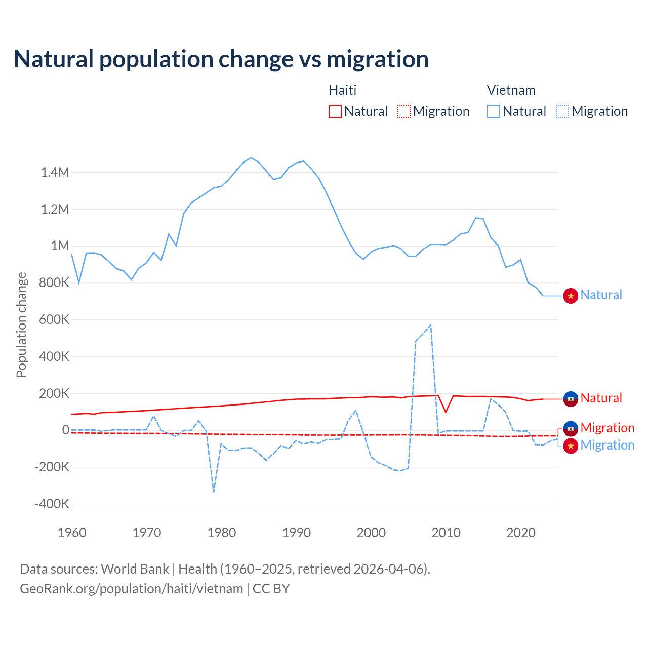 Over the last 10 years, 83.9% of the population change in Haiti is from natural causes (a gain of 1,740,319 people) and 16.1% is from migration (a loss of 333,076 people). In Vietnam 97.7% is from natural causes (a gain of 9,349,756 people) and 2.29% is from migration (a gain of 219,073 people).