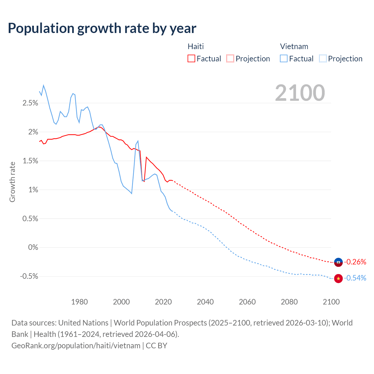 - For the last 10 years, Haiti has had an average growth rate of +1.29% per year vs +0.99% in Vietnam.
