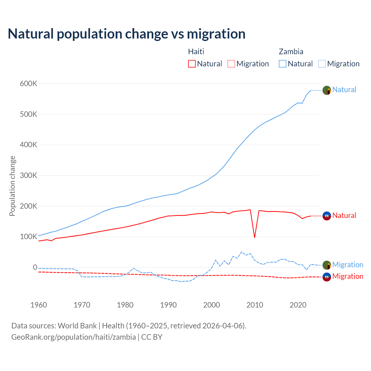 Over the last 10 years, 83.9% of the population change in Haiti is from natural causes (a gain of 1,740,319 people) and 16.1% is from migration (a loss of 333,076 people). In Zambia 97.4% is from natural causes (a gain of 5,233,797 people) and 2.58% is from migration (a gain of 138,554 people).