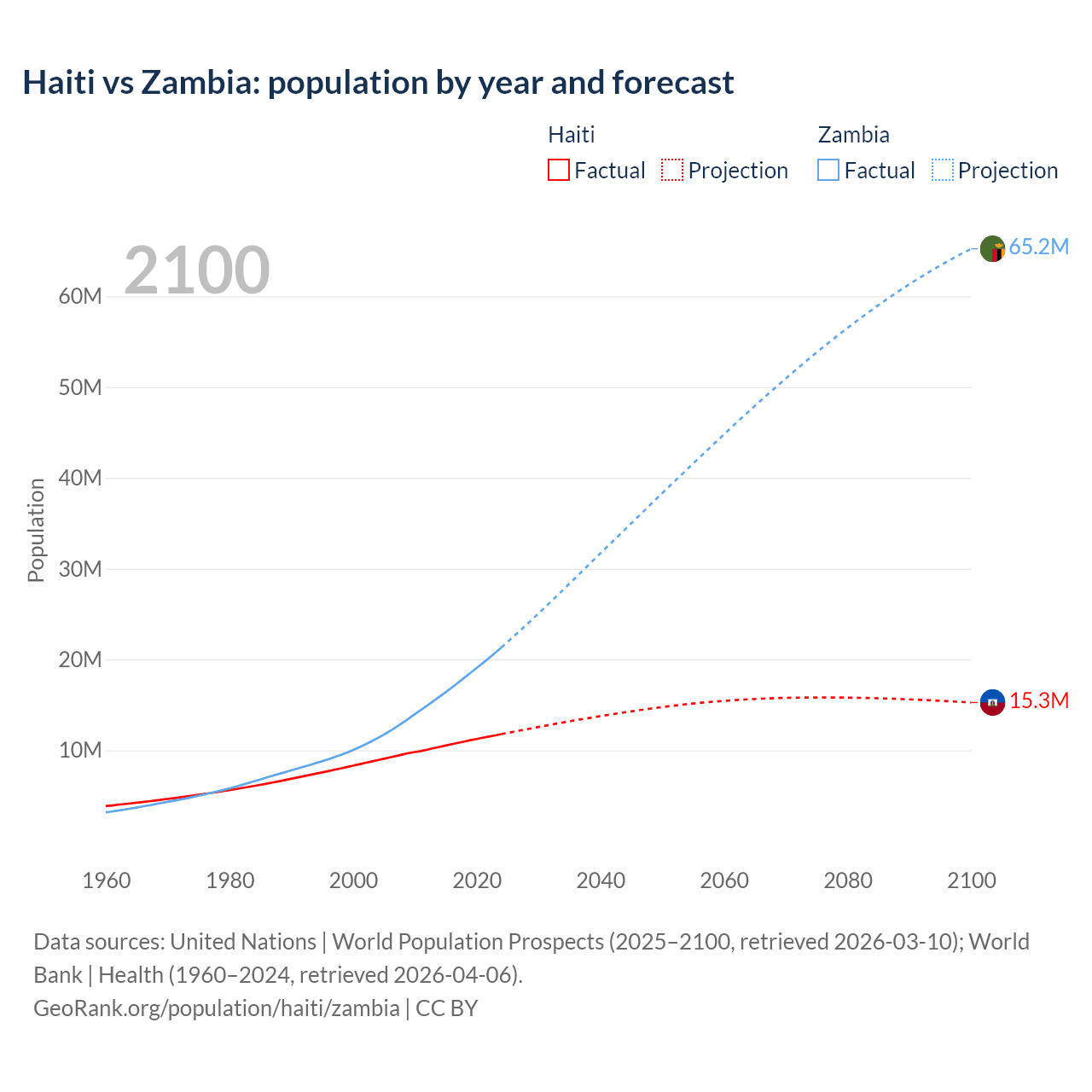 The latest officially reported population of Haiti was 11,772,557 in 2024 vs 21,314,956 people in Zambia in 2024. In 2026, based on the adjusted UN estimation, the current Haiti's population is 12,076,663 people compared to 22,697,916 in Zambia.