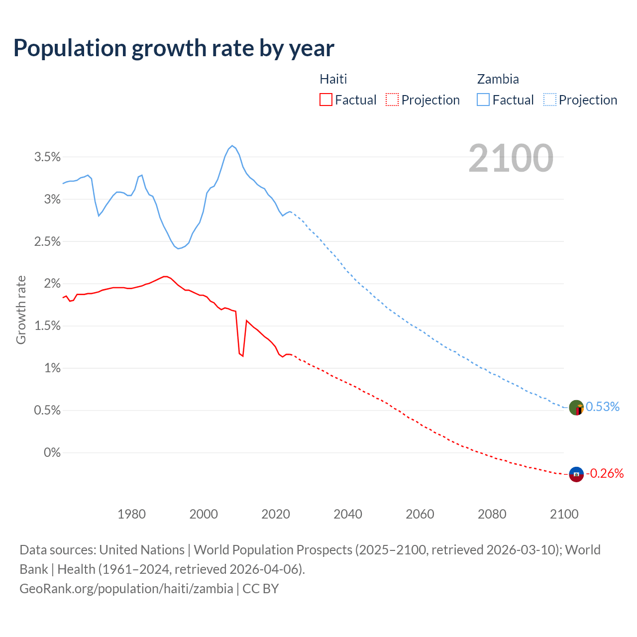 - For the last 10 years, Haiti has had an average growth rate of +1.29% per year vs +3% in Zambia.