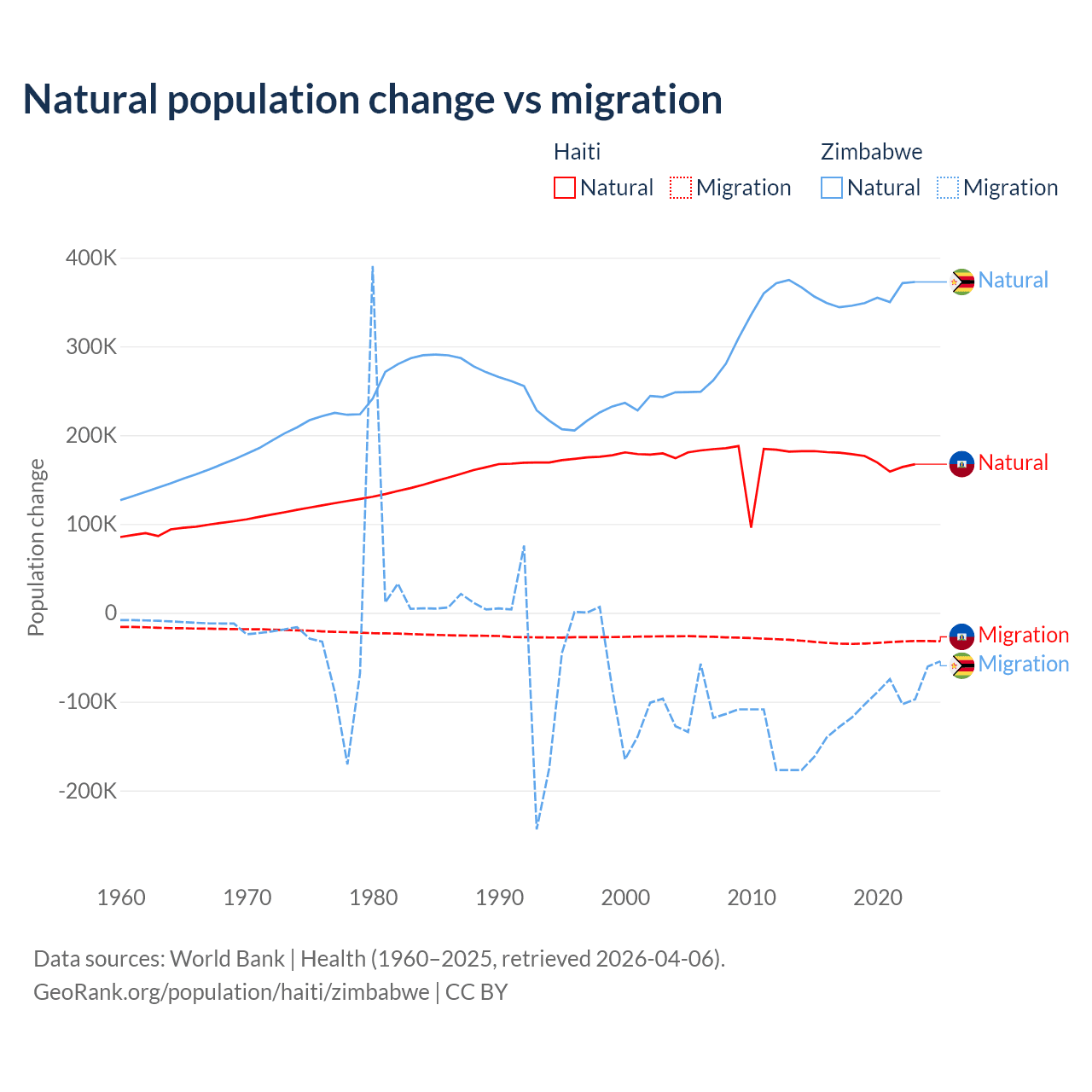 Over the last 10 years, 83.9% of the population change in Haiti is from natural causes (a gain of 1,740,319 people) and 16.1% is from migration (a loss of 333,076 people). In Zimbabwe 74.9% is from natural causes (a gain of 3,558,487 people) and 25.1% is from migration (a loss of 1,192,807 people).