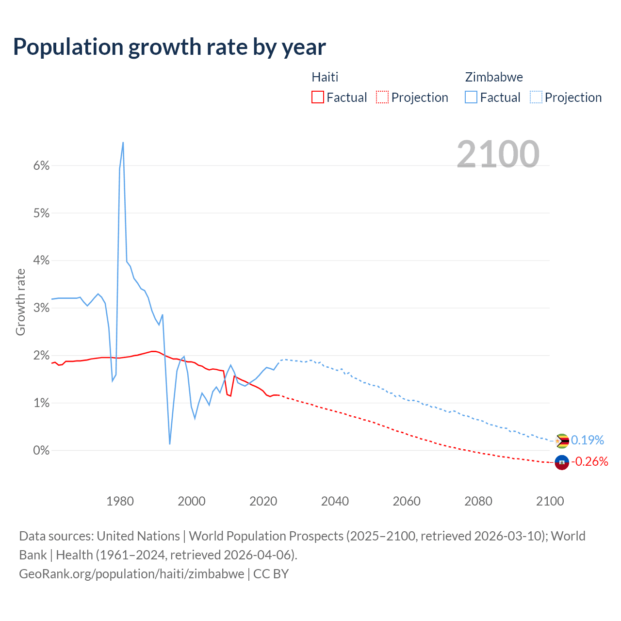 - For the last 10 years, Haiti has had an average growth rate of +1.29% per year vs +1.57% in Zimbabwe.