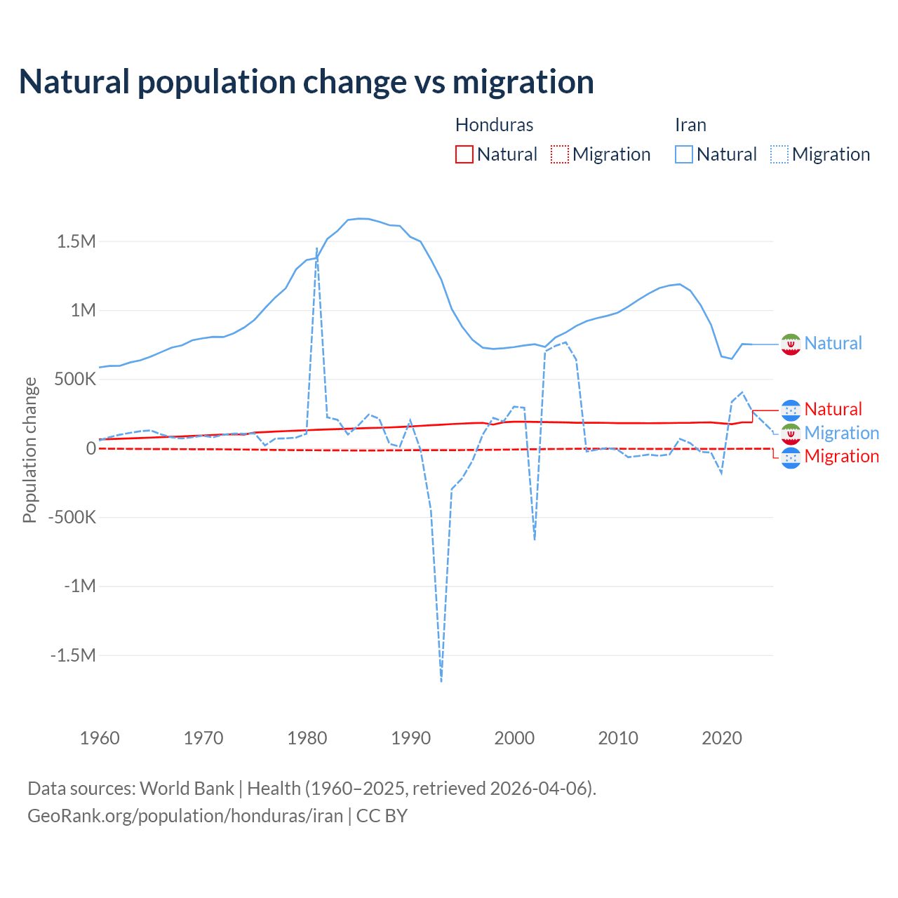Over the last 10 years, 96.7% of the population change in Honduras is from natural causes (a gain of 1,821,125 people) and 3.29% is from migration (a loss of 61,965 people). In Iran 92.5% is from natural causes (a gain of 9,405,860 people) and 7.46% is from migration (a gain of 757,979 people).