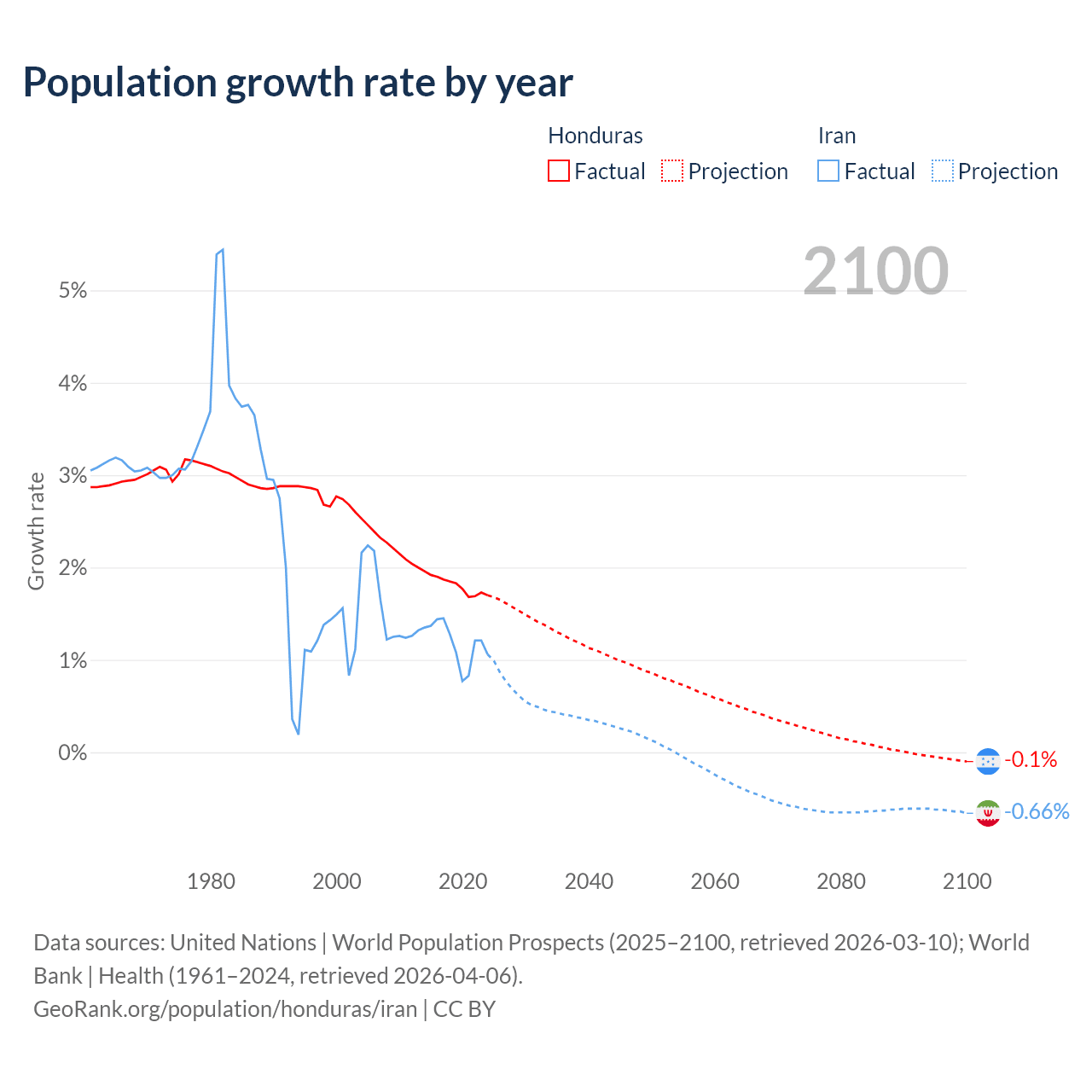 - For the last 10 years, Honduras has had an average growth rate of +1.81% per year vs +1.19% in Iran.