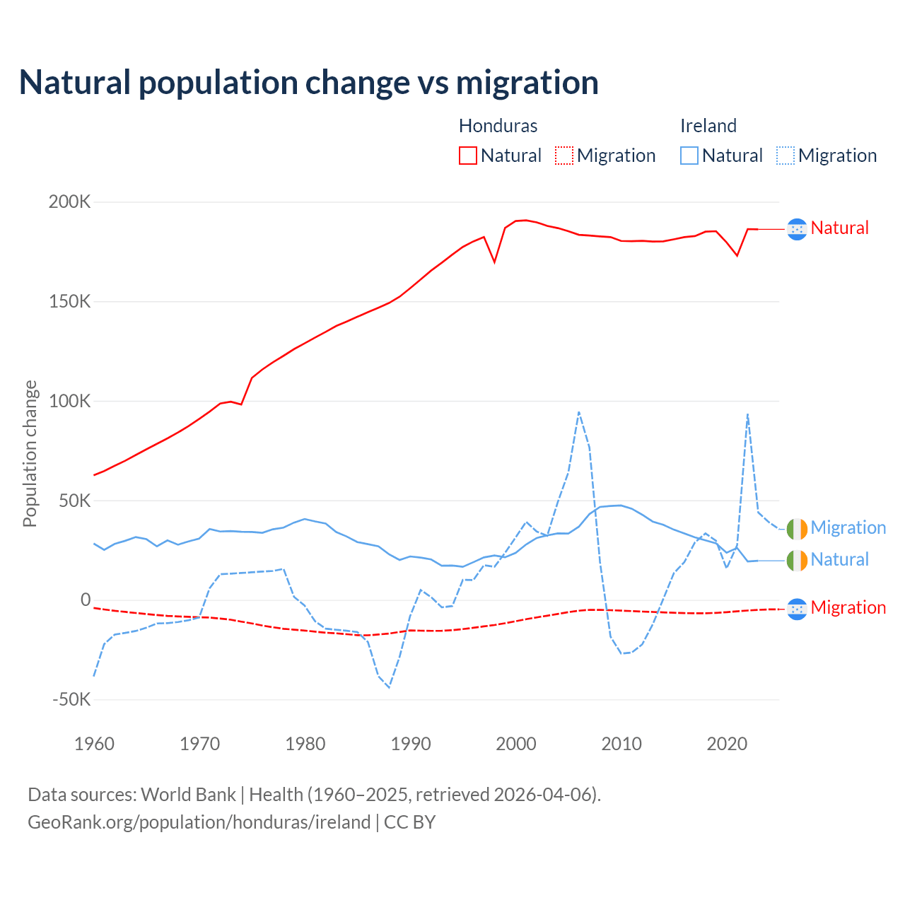 Over the last 10 years, 96.7% of the population change in Honduras is from natural causes (a gain of 1,821,125 people) and 3.29% is from migration (a loss of 61,965 people). In Ireland 48.2% is from natural causes (a gain of 284,644 people) and 51.8% is from migration (a gain of 305,297 people).