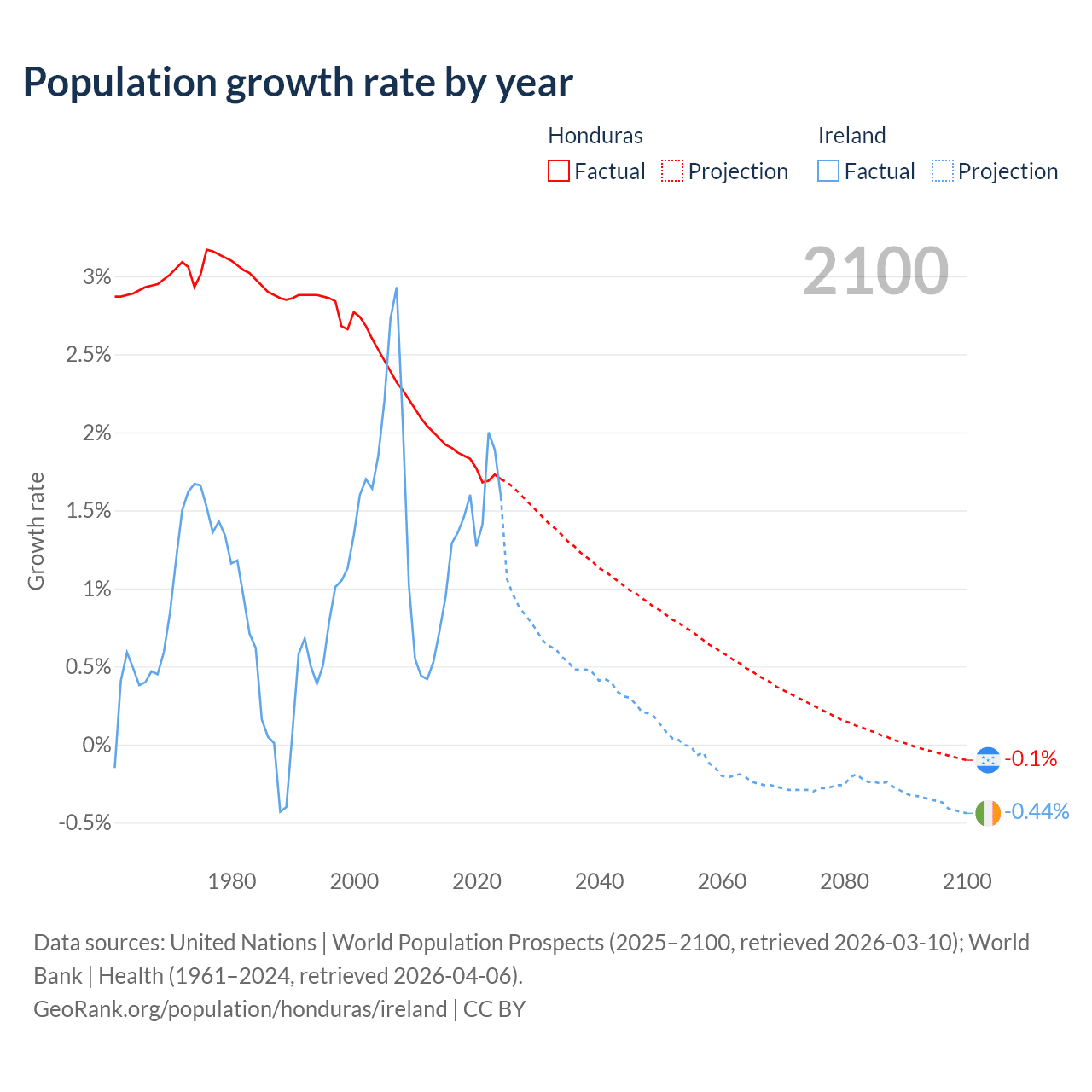 - For the last 10 years, Honduras has had an average growth rate of +1.81% per year vs +1.41% in Ireland.