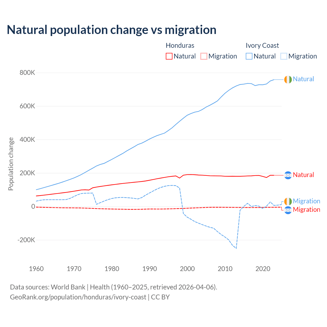 Over the last 10 years, 96.7% of the population change in Honduras is from natural causes (a gain of 1,821,125 people) and 3.29% is from migration (a loss of 61,965 people). In Ivory Coast 99.7% is from natural causes (a gain of 7,348,944 people) and 0.33% is from migration (a gain of 24,432 people).