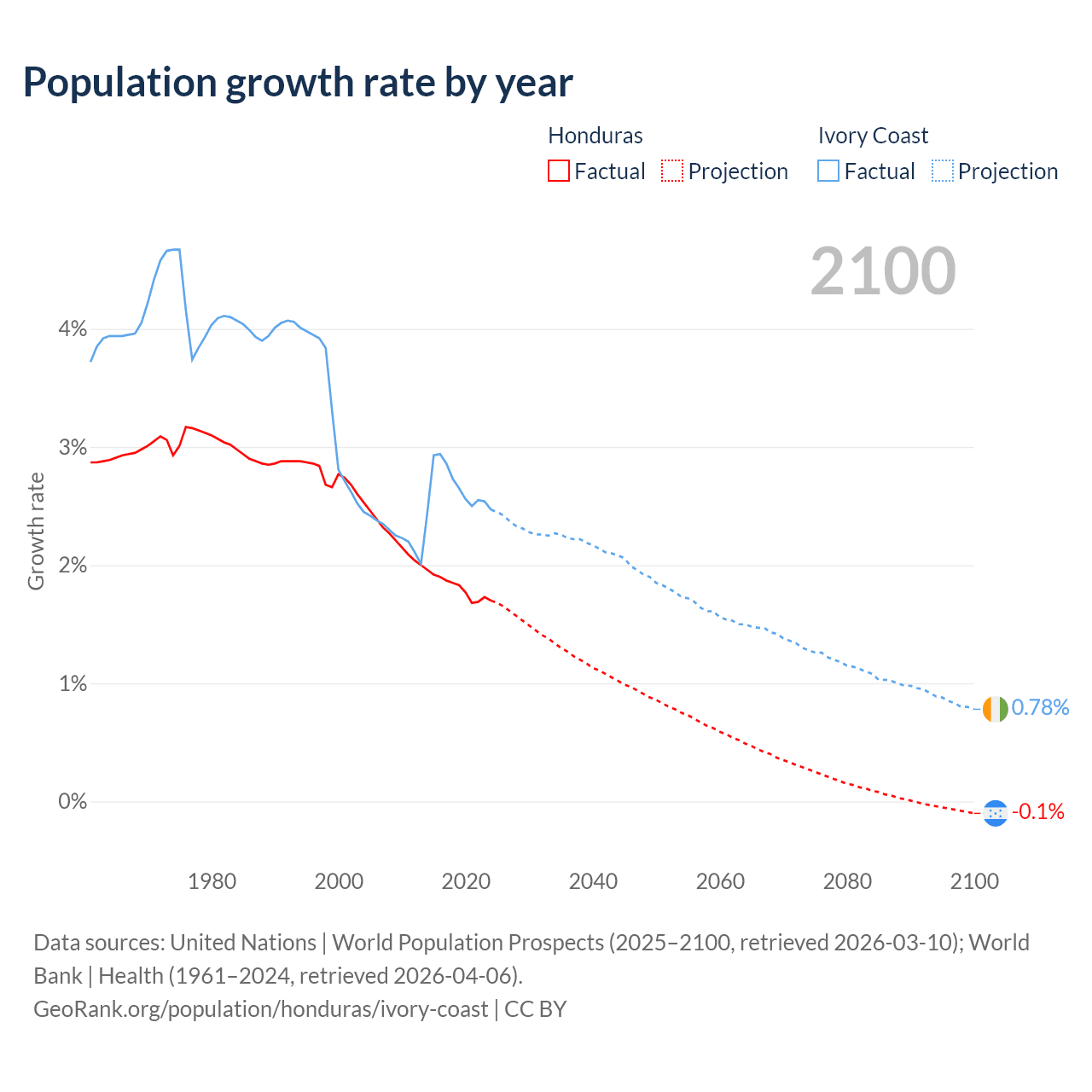 - For the last 10 years, Honduras has had an average growth rate of +1.81% per year vs +2.65% in Ivory Coast.