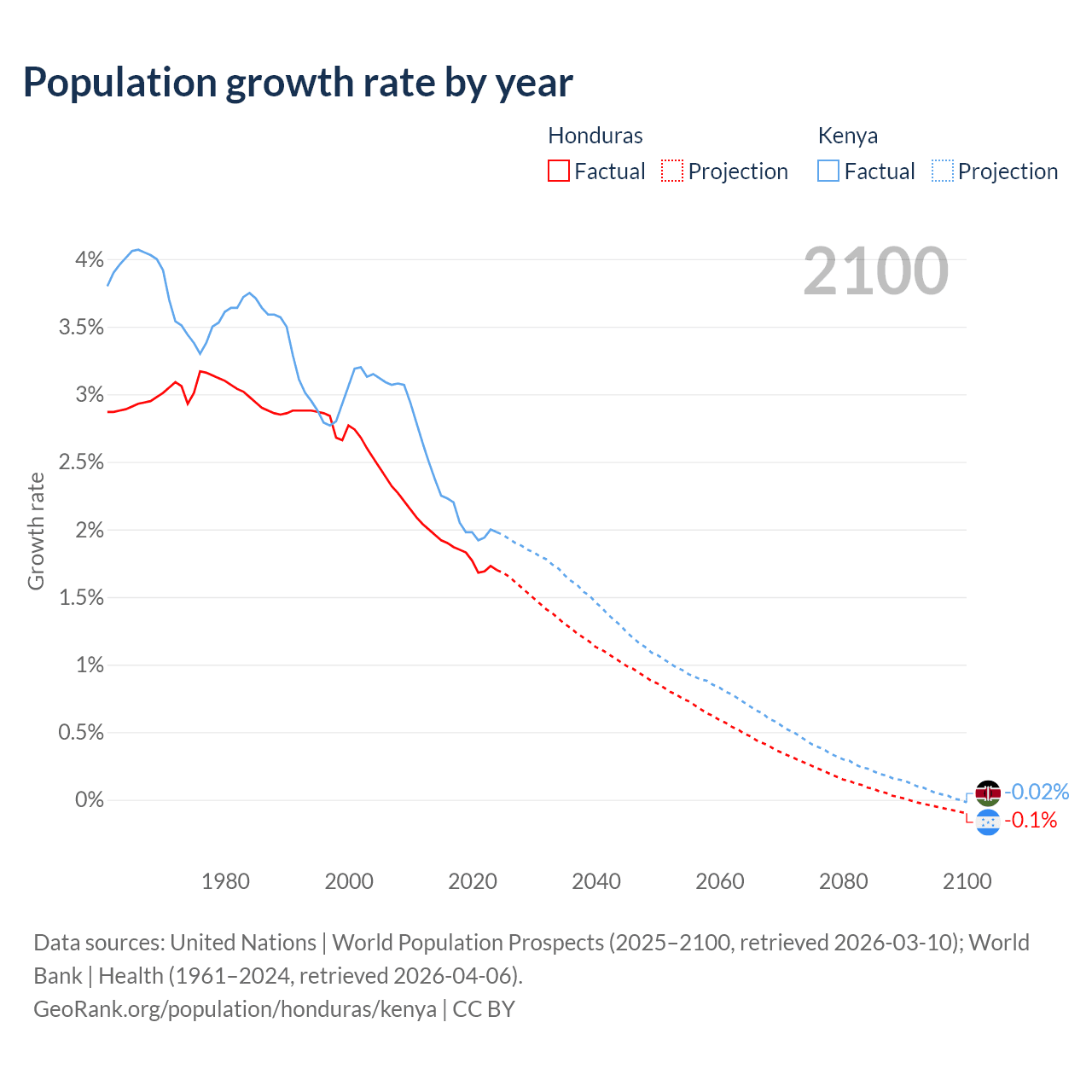 - For the last 10 years, Honduras has had an average growth rate of +1.81% per year vs +2.08% in Kenya.