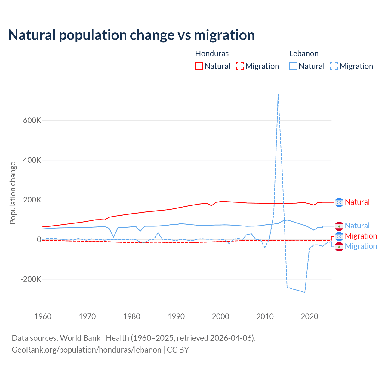 Over the last 10 years, 96.7% of the population change in Honduras is from natural causes (a gain of 1,821,125 people) and 3.29% is from migration (a loss of 61,965 people). In Lebanon 40.1% is from natural causes (a gain of 739,256 people) and 59.9% is from migration (a loss of 1,103,772 people).