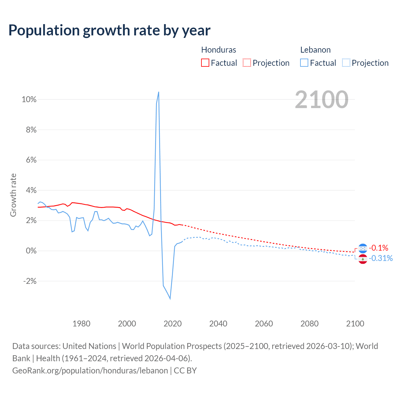 - For the last 10 years, Honduras has had an average growth rate of +1.81% per year vs +0.16% in Lebanon.