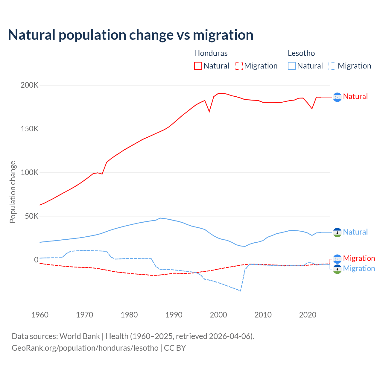 Over the last 10 years, 96.7% of the population change in Honduras is from natural causes (a gain of 1,821,125 people) and 3.29% is from migration (a loss of 61,965 people). In Lesotho 84.2% is from natural causes (a gain of 315,836 people) and 15.8% is from migration (a loss of 59,457 people).