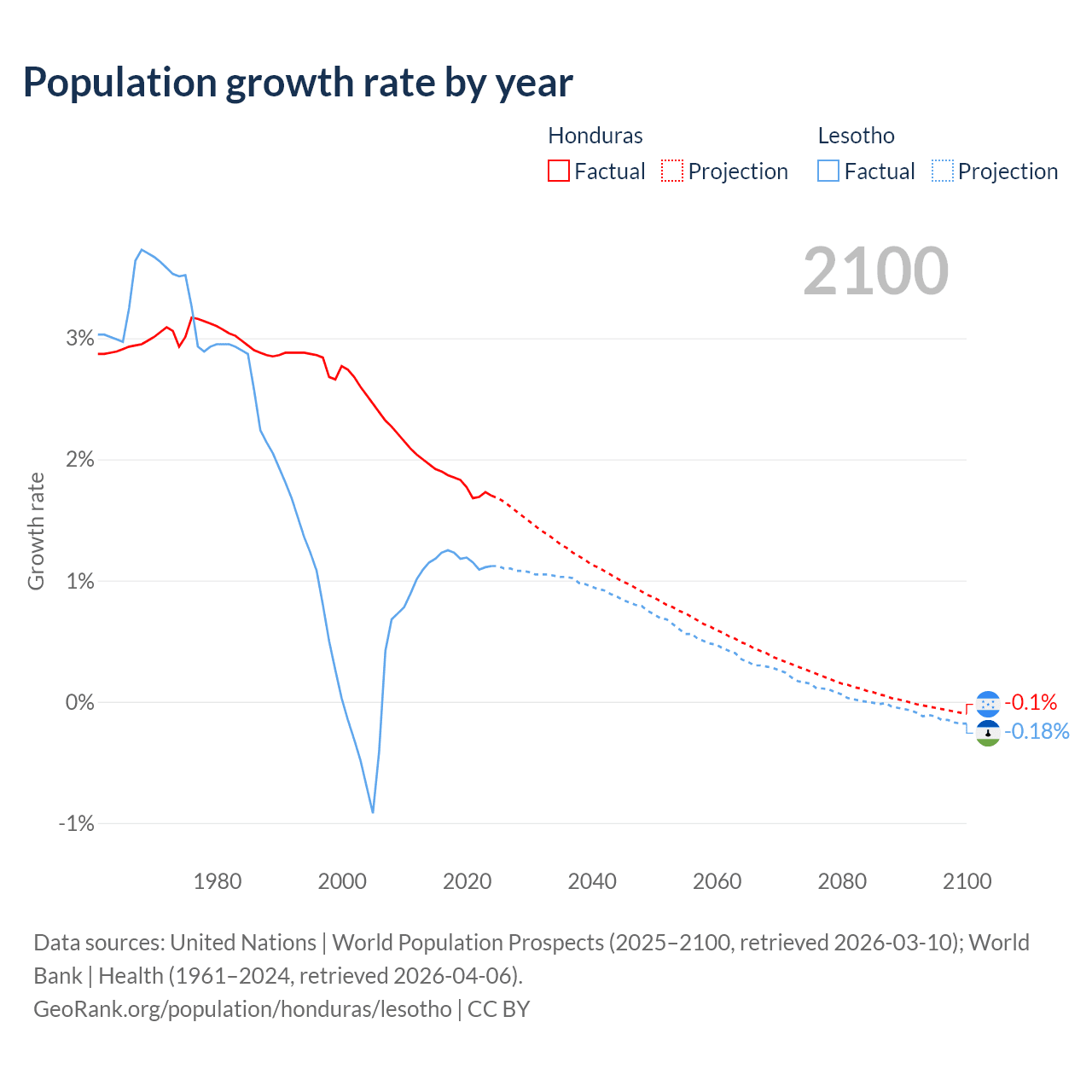 - For the last 10 years, Honduras has had an average growth rate of +1.81% per year vs +1.17% in Lesotho.
