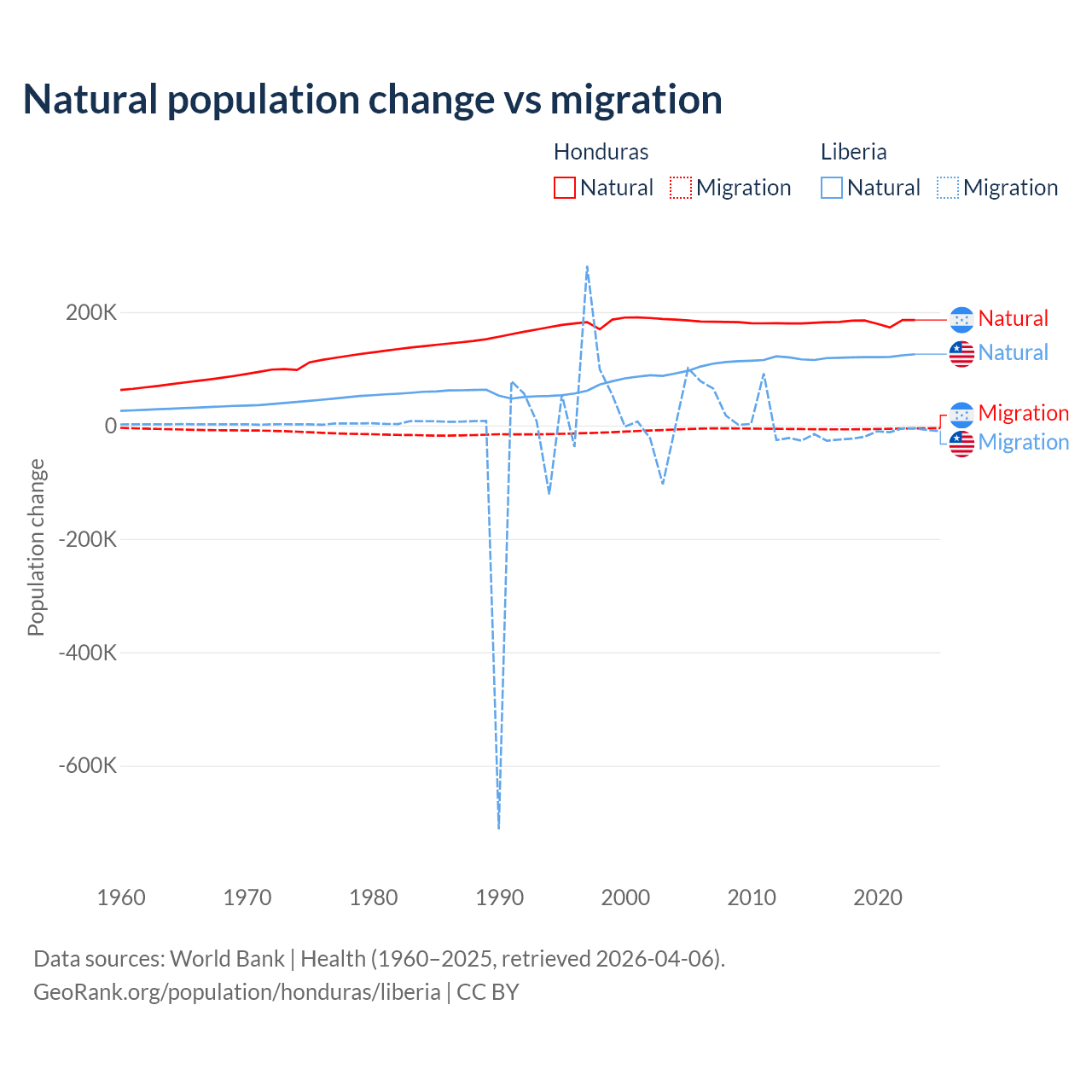 Over the last 10 years, 96.7% of the population change in Honduras is from natural causes (a gain of 1,821,125 people) and 3.29% is from migration (a loss of 61,965 people). In Liberia 87.7% is from natural causes (a gain of 1,202,387 people) and 12.3% is from migration (a loss of 168,316 people).