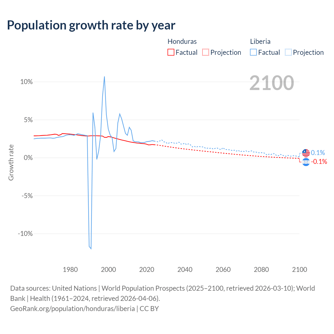 - For the last 10 years, Honduras has had an average growth rate of +1.81% per year vs +2.09% in Liberia.