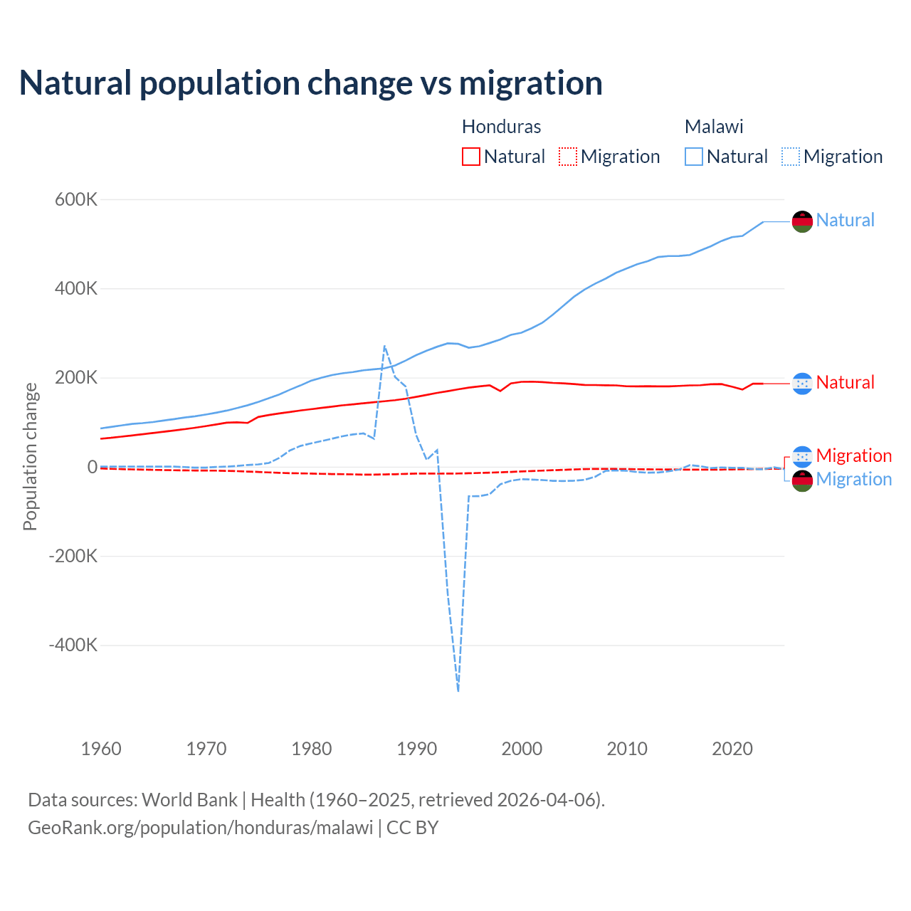 Over the last 10 years, 96.7% of the population change in Honduras is from natural causes (a gain of 1,821,125 people) and 3.29% is from migration (a loss of 61,965 people). In Malawi 99.3% is from natural causes (a gain of 5,019,393 people) and 0.67% is from migration (a loss of 33,768 people).