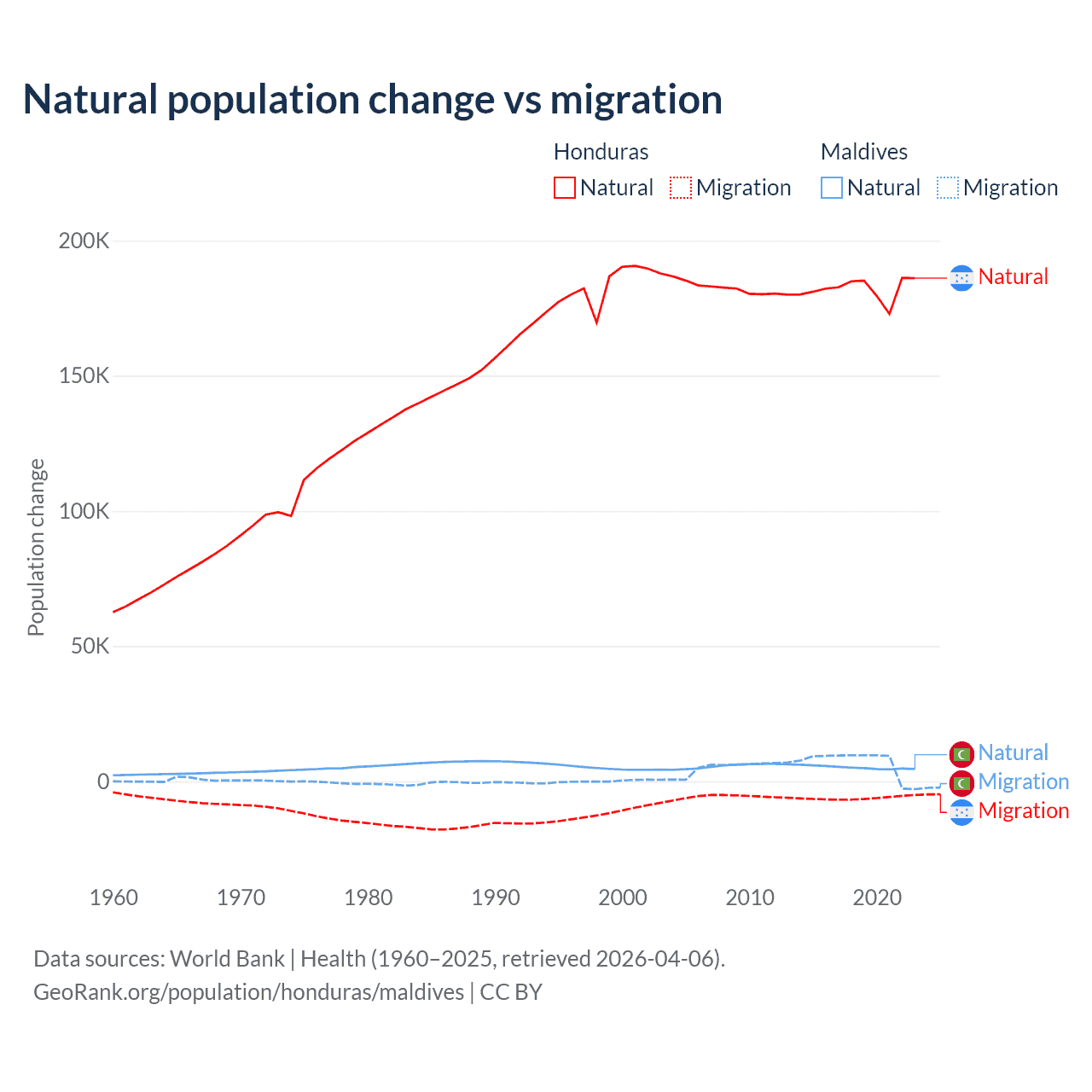 Over the last 10 years, 96.7% of the population change in Honduras is from natural causes (a gain of 1,821,125 people) and 3.29% is from migration (a loss of 61,965 people). In Maldives 42.7% is from natural causes (a gain of 51,342 people) and 57.3% is from migration (a gain of 68,788 people).