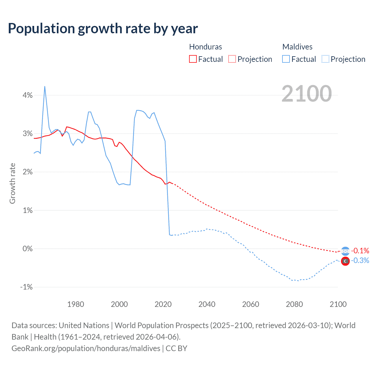 - For the last 10 years, Honduras has had an average growth rate of +1.81% per year vs +2.56% in Maldives.