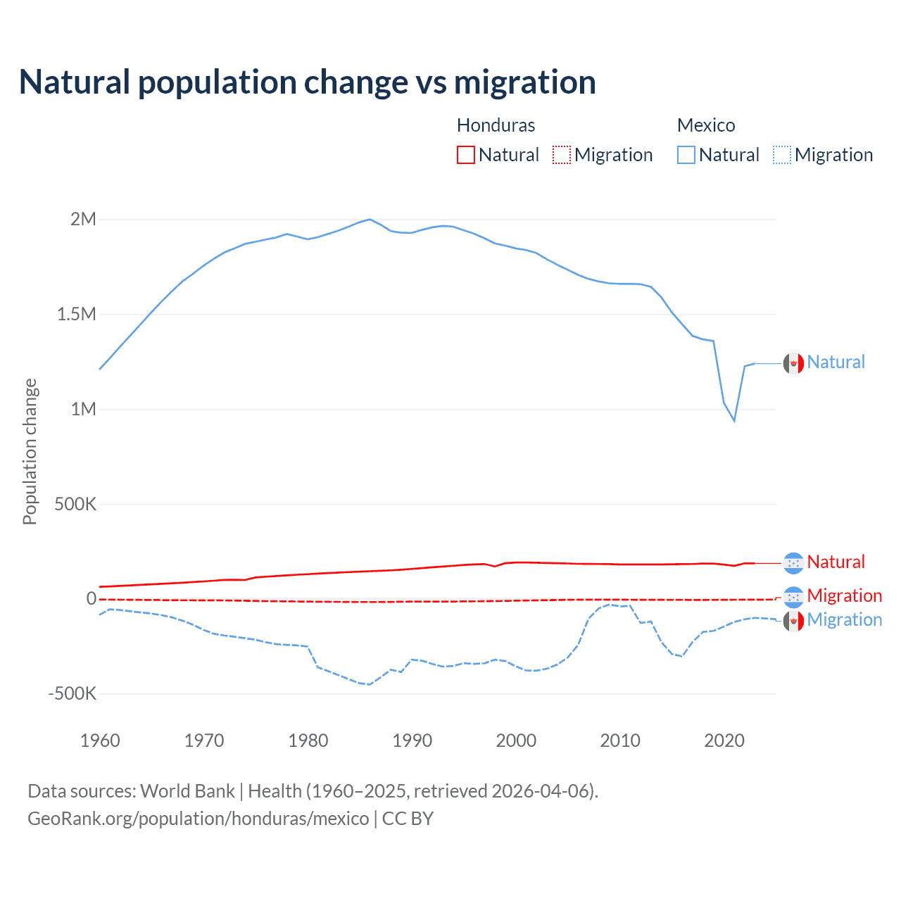 Over the last 10 years, 96.7% of the population change in Honduras is from natural causes (a gain of 1,821,125 people) and 3.29% is from migration (a loss of 61,965 people). In Mexico 87.5% is from natural causes (a gain of 13,080,136 people) and 12.5% is from migration (a loss of 1,876,544 people).