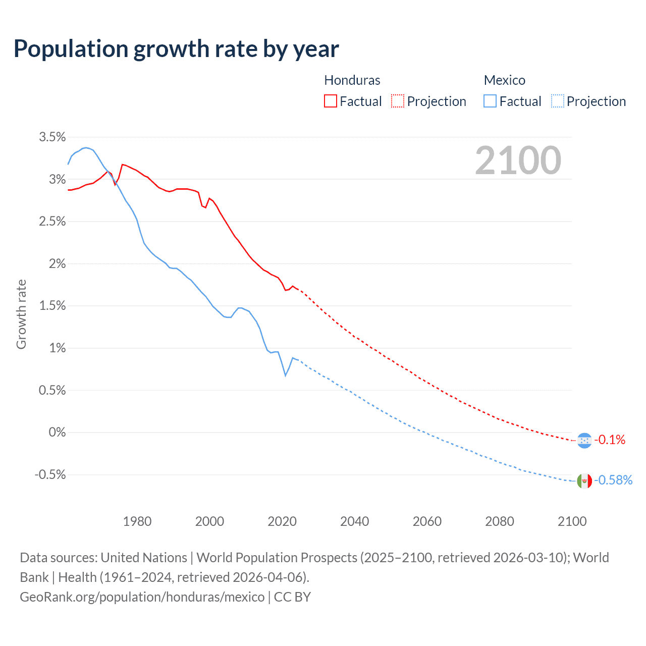 - For the last 10 years, Honduras has had an average growth rate of +1.81% per year vs +0.92% in Mexico.