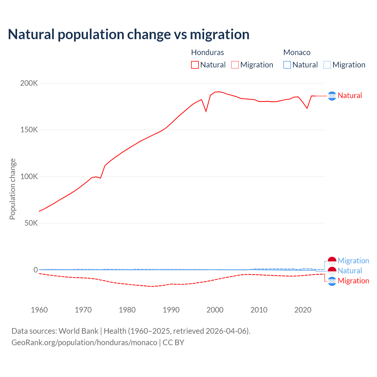 Over the last 10 years, 96.7% of the population change in Honduras is from natural causes (a gain of 1,821,125 people) and 3.29% is from migration (a loss of 61,965 people). In Monaco 37.3% is from natural causes (a loss of 4,357 people) and 62.7% is from migration (a gain of 7,333 people).