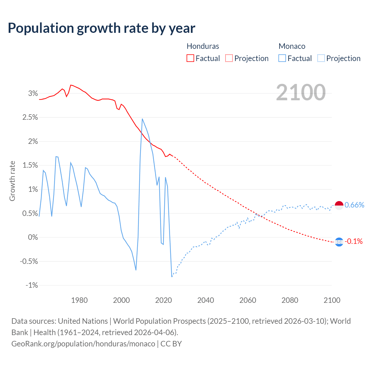 - For the last 10 years, Honduras has had an average growth rate of +1.81% per year vs +0.79% in Monaco.