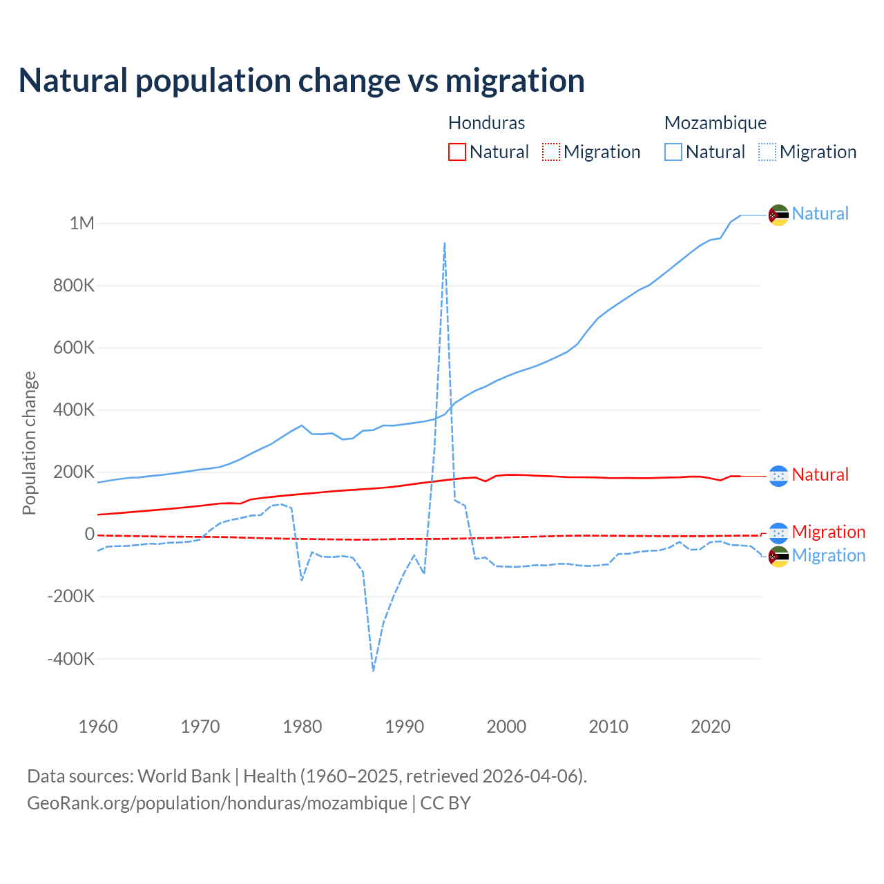 Over the last 10 years, 96.7% of the population change in Honduras is from natural causes (a gain of 1,821,125 people) and 3.29% is from migration (a loss of 61,965 people). In Mozambique 95.9% is from natural causes (a gain of 9,108,203 people) and 4.15% is from migration (a loss of 393,923 people).
