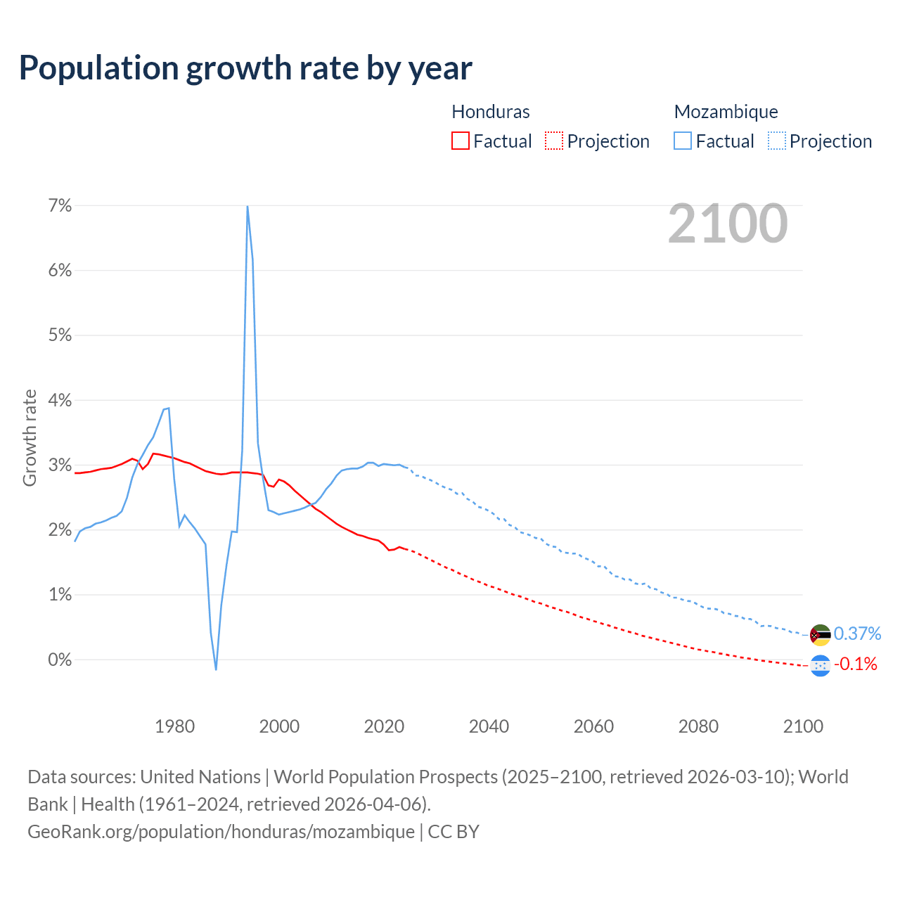 - For the last 10 years, Honduras has had an average growth rate of +1.81% per year vs +2.99% in Mozambique.