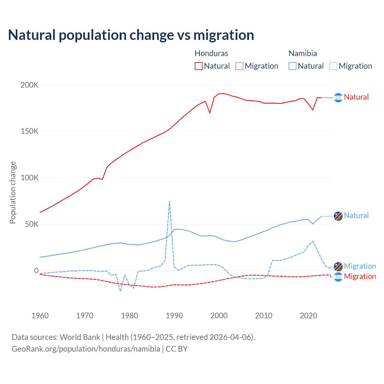 Over the last 10 years, 96.7% of the population change in Honduras is from natural causes (a gain of 1,821,125 people) and 3.29% is from migration (a loss of 61,965 people). In Namibia 74.3% is from natural causes (a gain of 532,532 people) and 25.7% is from migration (a gain of 183,837 people).