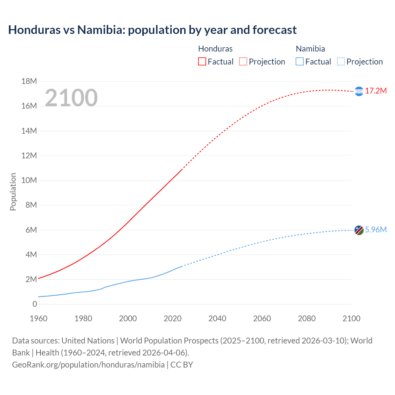 The latest officially reported population of Honduras was 10,825,703 in 2024 vs 3,030,131 people in Namibia in 2024. In 2026, based on the adjusted UN estimation, the current Honduras' population is 11,237,619 people compared to 3,173,089 in Namibia.